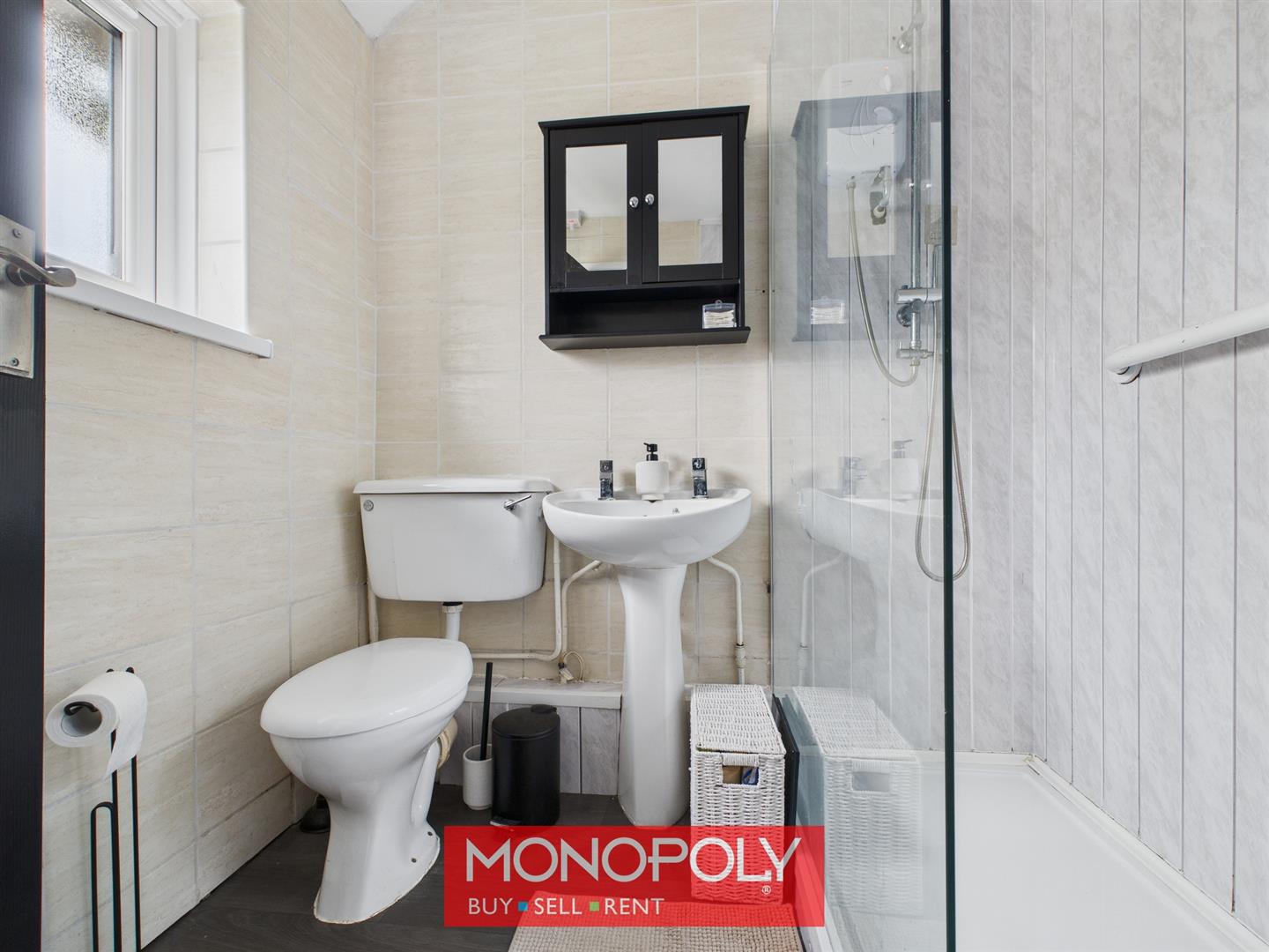 A three-piece white fitted bathroom suite, finished with wood-effect vinyl flooring and tiled walls, featuring a large walk-in shower with thermostatic controls and PVC panelling, a pedestal wash basin, WC, radiator, and extractor fan.