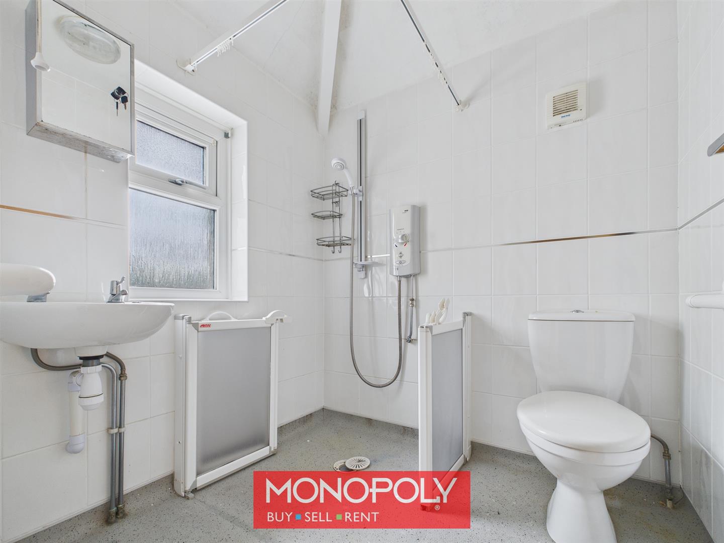 A wet-room style space designed with accessibility in mind. It includes a walk-in shower suitable for disabled access with an adjustable electric shower, a wall-mounted hand wash basin, and a low-flush WC. The room is fully tiled with a resin-effect floor and benefits from a side-facing privacy window.