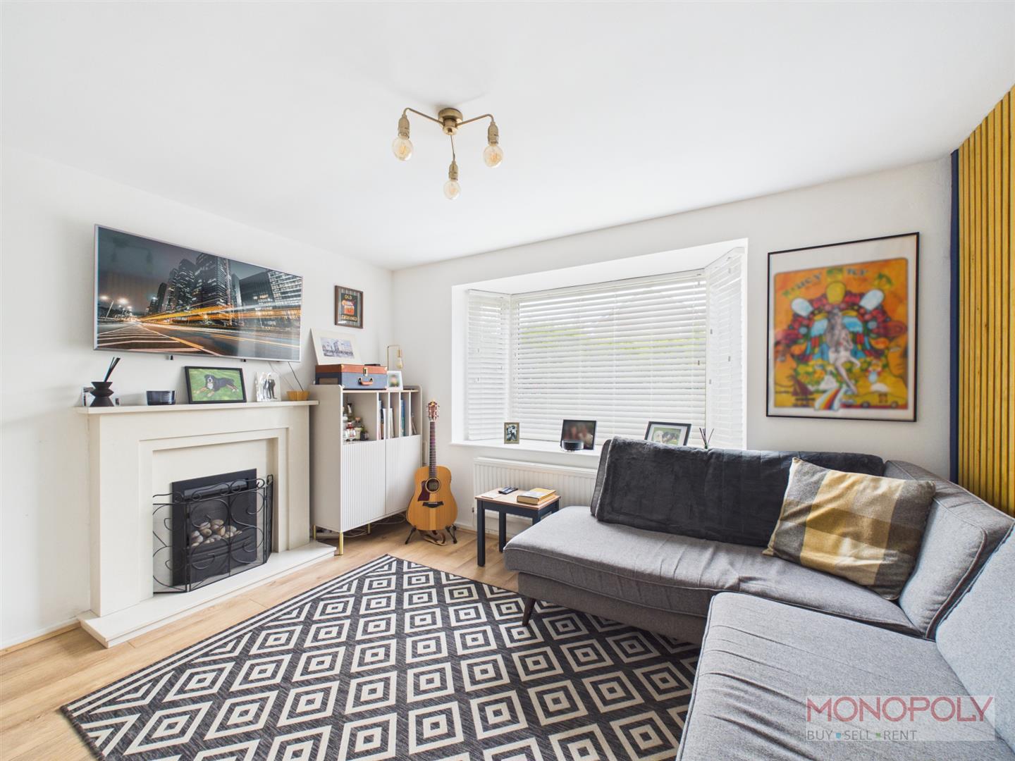 With UPVC double glazed bay window to the front with double panel radiator below. Staircase rising off to the first floor accommodation with under stairs recess, laminate wood flooring, Adam style fire surround with electric fire inset.