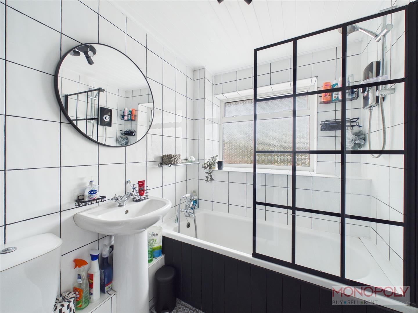 Comprising of a fitted suite with panel enclosed bath with shower over and screen, low level WC, pedestal wash hand basin, UPVC double glazed frosted window to the rear. Part tiled and part wood panelled walls, ladder style radiator.