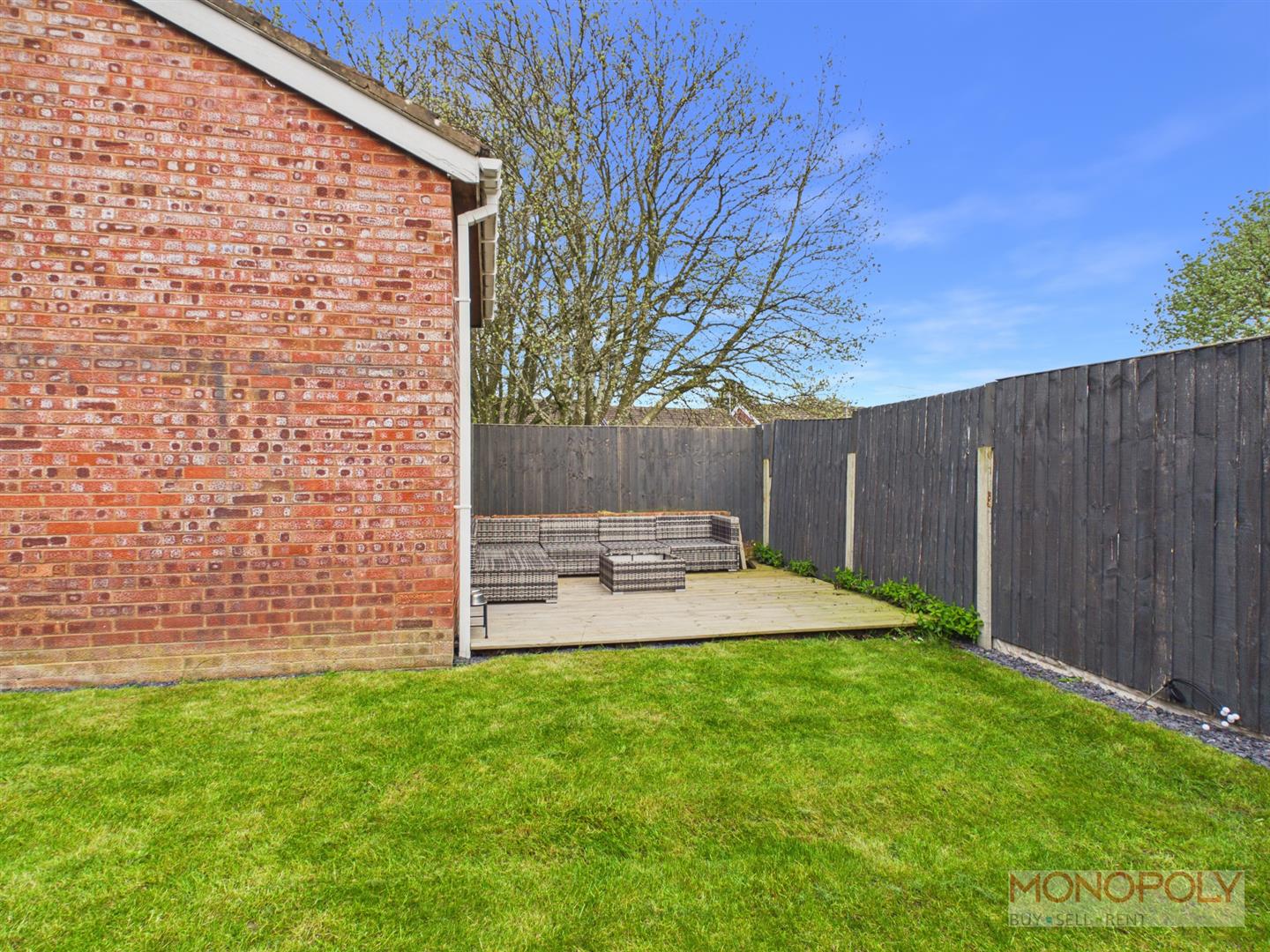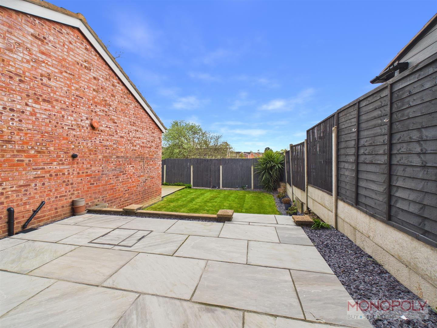 To the rear reveals a large paved patio, with steps down to a lawned garden area with slate chippings to its borders. To the rear of the garage there is a feature composite decked sitting area.