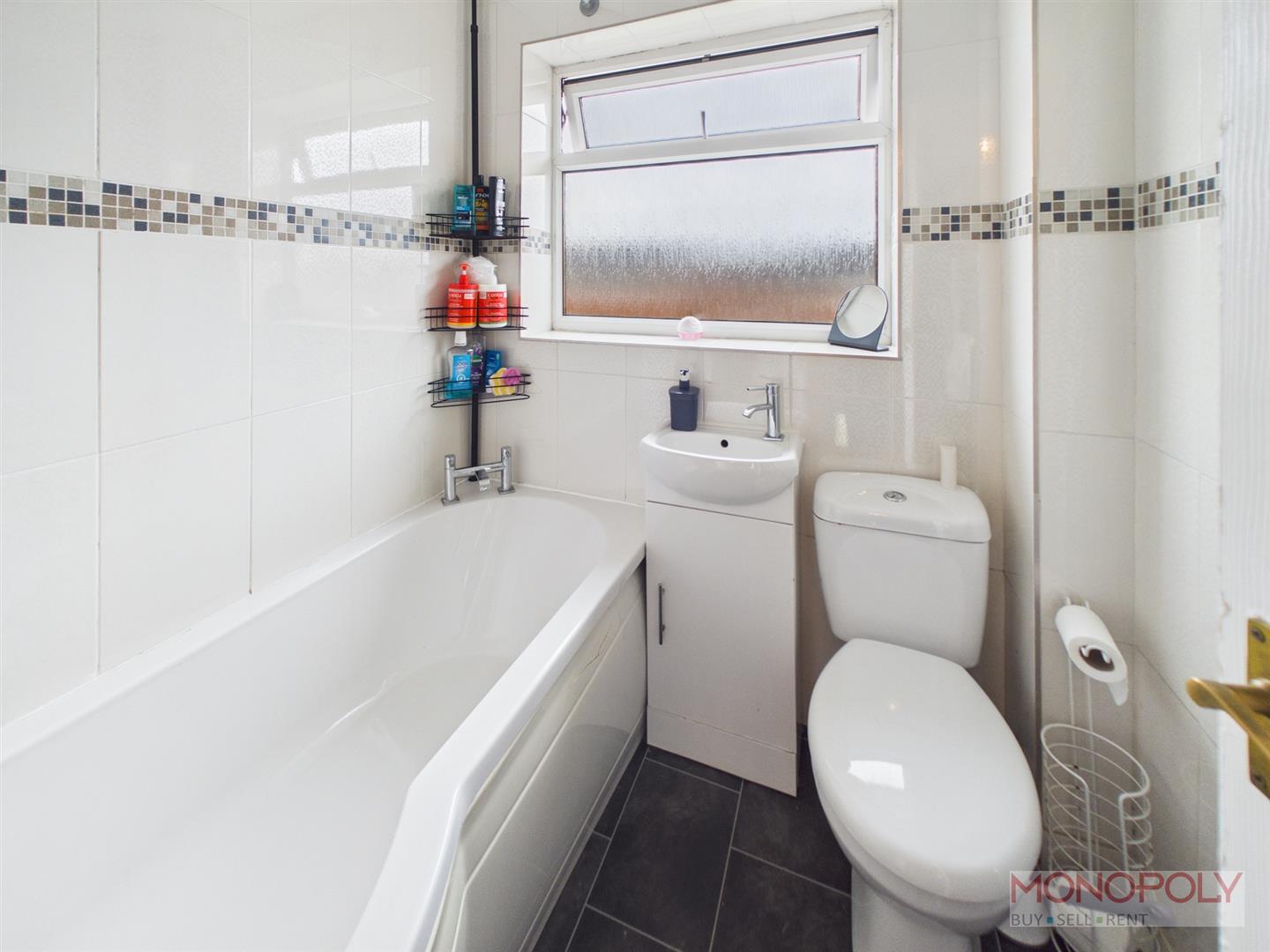 Comprising of a panel enclosed bath with shower over, wash hand basin, low level w.c., UPVC Double glazed and frosted window to the rear, Chrome ladder style radiator/towel rail, fully tiled walls.