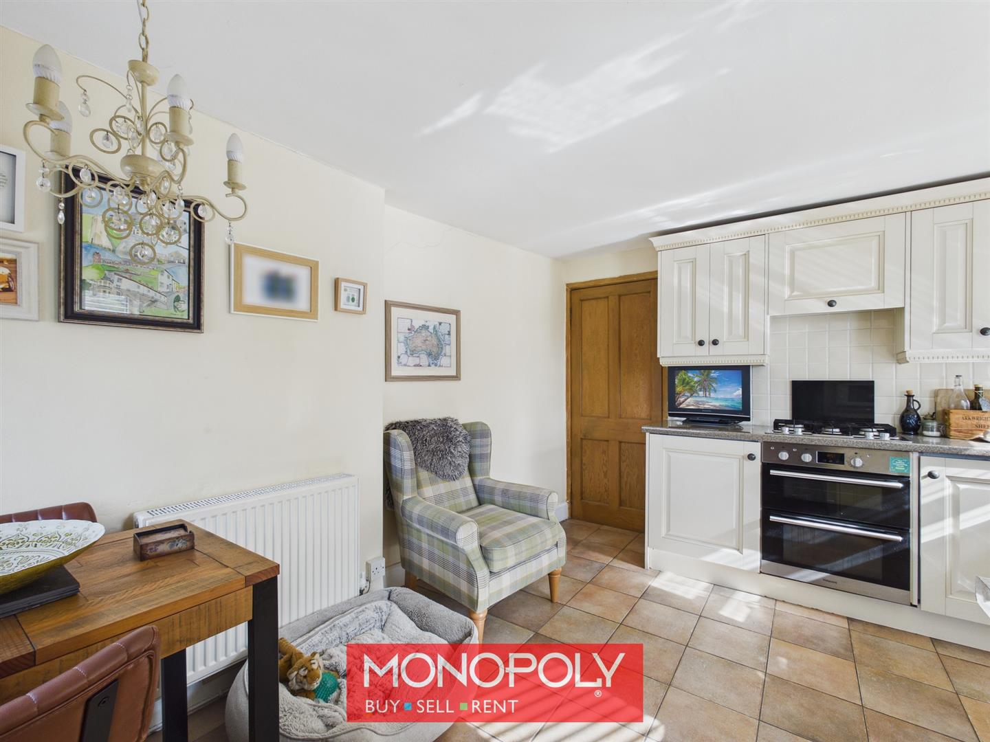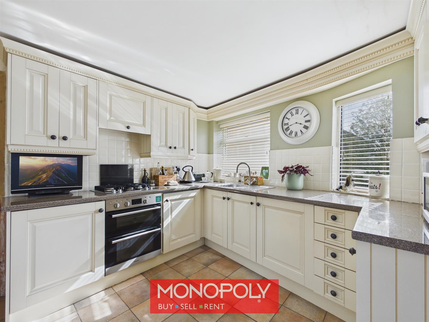 The kitchen is fitted with cream fronted cabinetry complemented by tiled flooring and tiled splashbacks. It is well equipped with an integrated fridge, freezer, washing machine and dishwasher, along with a four burner gas hob, under counter grill oven and concealed extractor hood. A stainless steel sink with drainer and mixer tap sits beneath one of the windows, while the boiler, approximately seven years old, is neatly housed within a cupboard. With two double glazed windows to the side and one to the rear, a radiator, and space for a small table and chairs, the kitchen offers both practicality and room for informal dining.