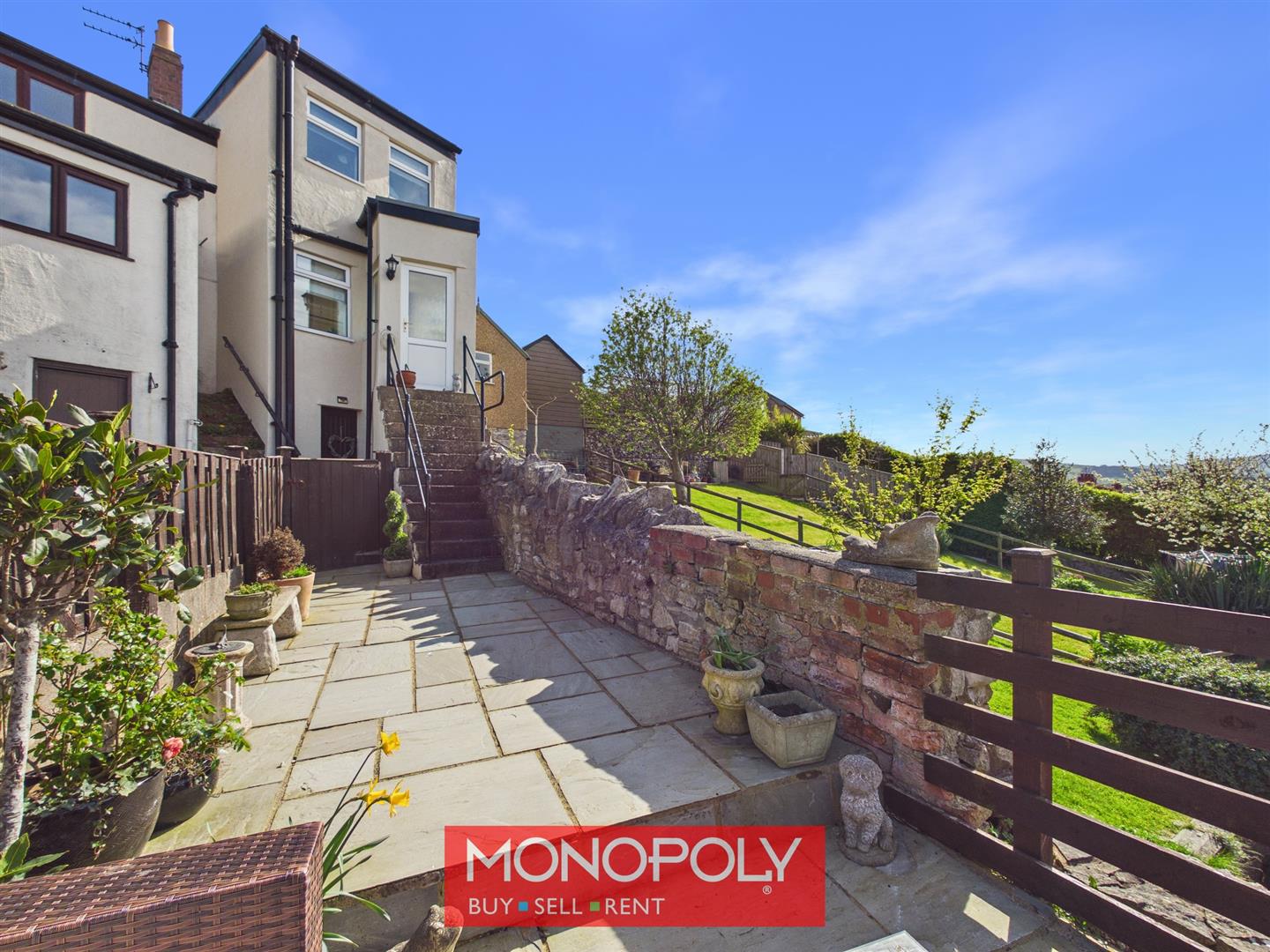 The enclosed rear garden has been designed for low maintenance, with a block paved patio providing an ideal space for outdoor seating. Partial stone walling adds character, while timber fencing and a wooden gate lead through to the walkway. There is also access to the cellar from the garden.