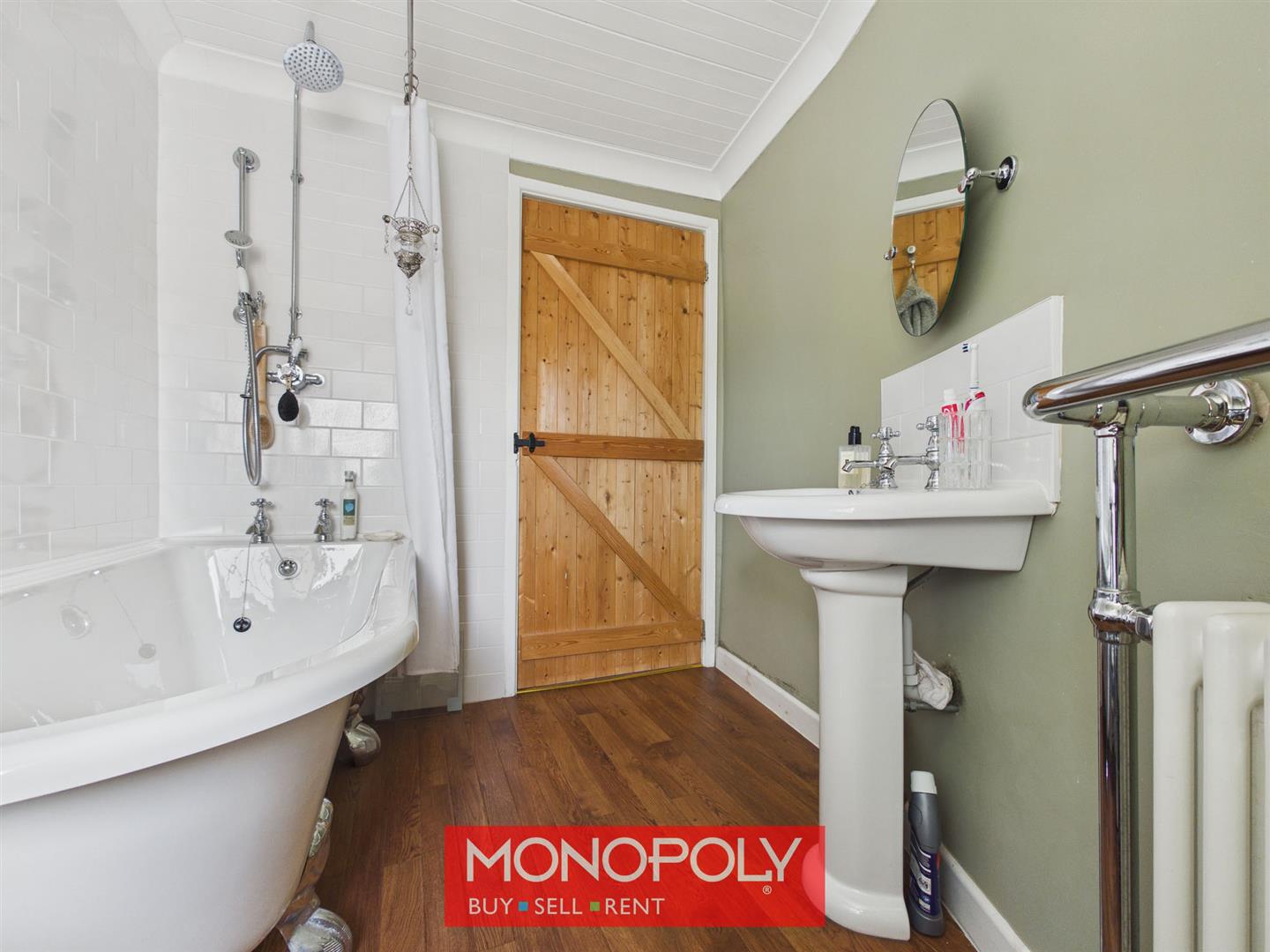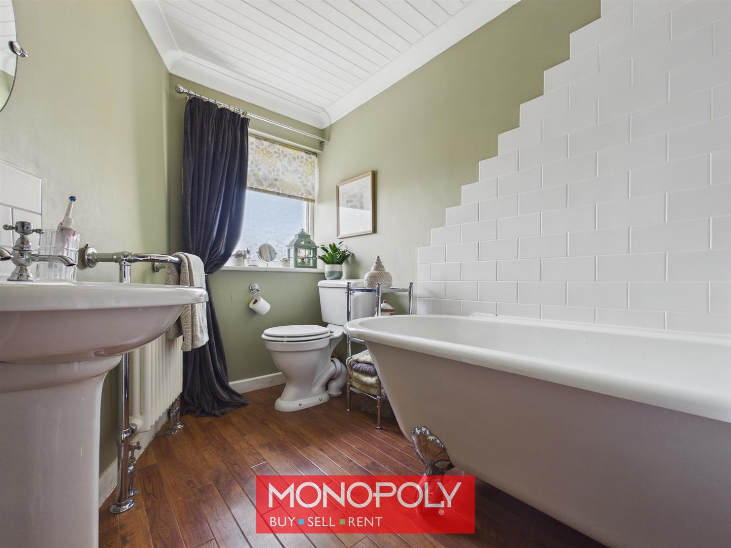 The bathroom is fitted with a traditional claw footed bath, wash hand basin with tiled splashback, and WC. Finished with Karndean wood flooring, a radiator with a chrome towel rail, tiled surround to the bath, and an obscure glazed uPVC window, the room combines character with practicality.