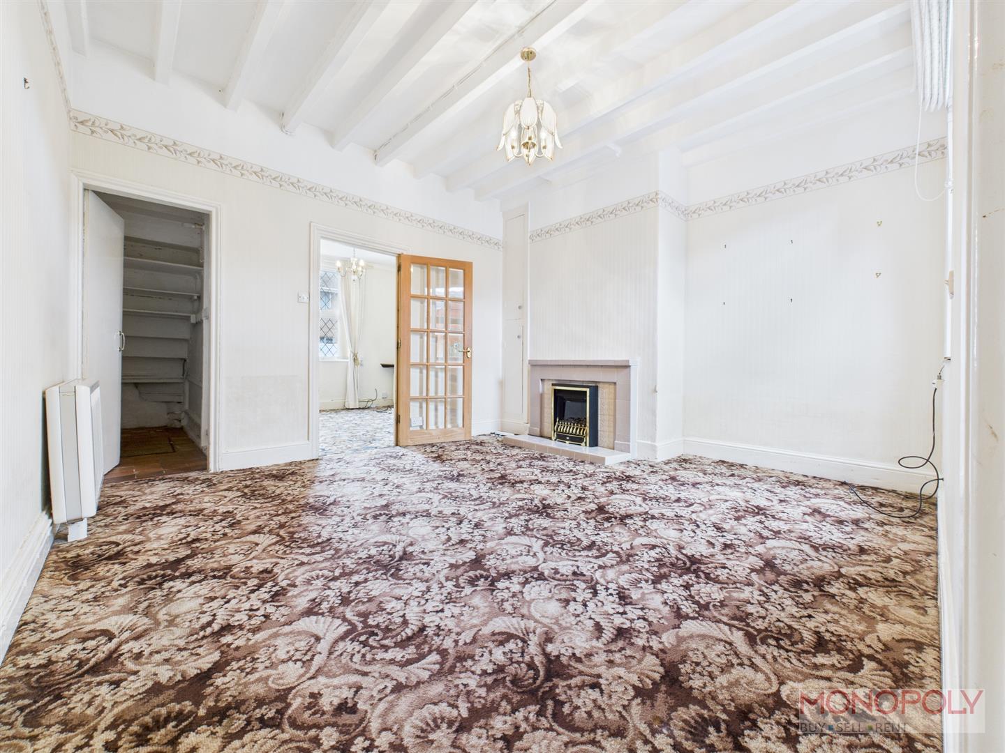 UPVC double glazed window to the rear elevation. Electric fireplace with tiled hearth and surround. Storage cupboard with shelving. Door into under-stairs storage cupboard with tiled flooring and lighting. Finished with carpet flooring, ceiling light point, electric radiator and beamed ceiling. Door into kitchen.