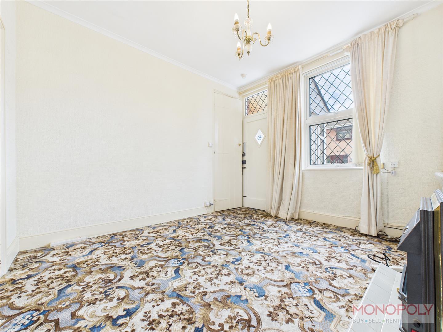 UPVC double glazed leaded window to front elevation. Electric fireplace with tiled surround and hearth. Electric heater, carpet flooring, ceiling light point, door leading to staircase and glazed wooden door into dining room.