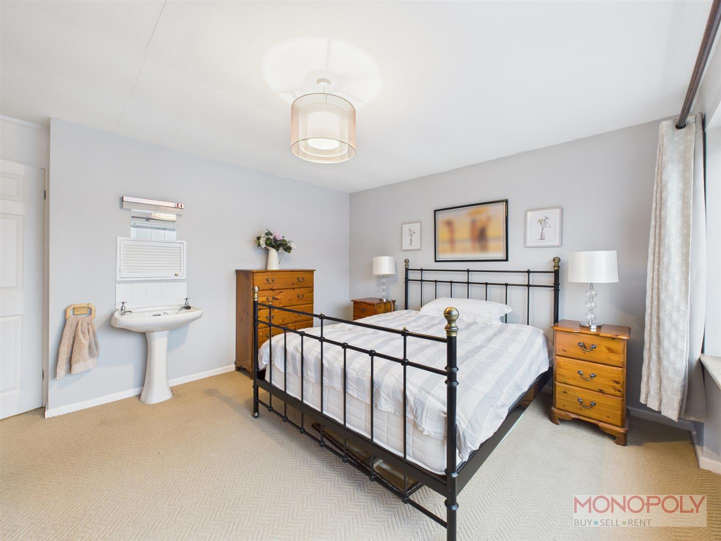UPVC double glazed window to the front elevation. Pedestal wash hand basin with tiled splash back storage cupboard, wall mounted light and shave point. Finished with carpet flooring, ceiling light point, and panelled radiator.