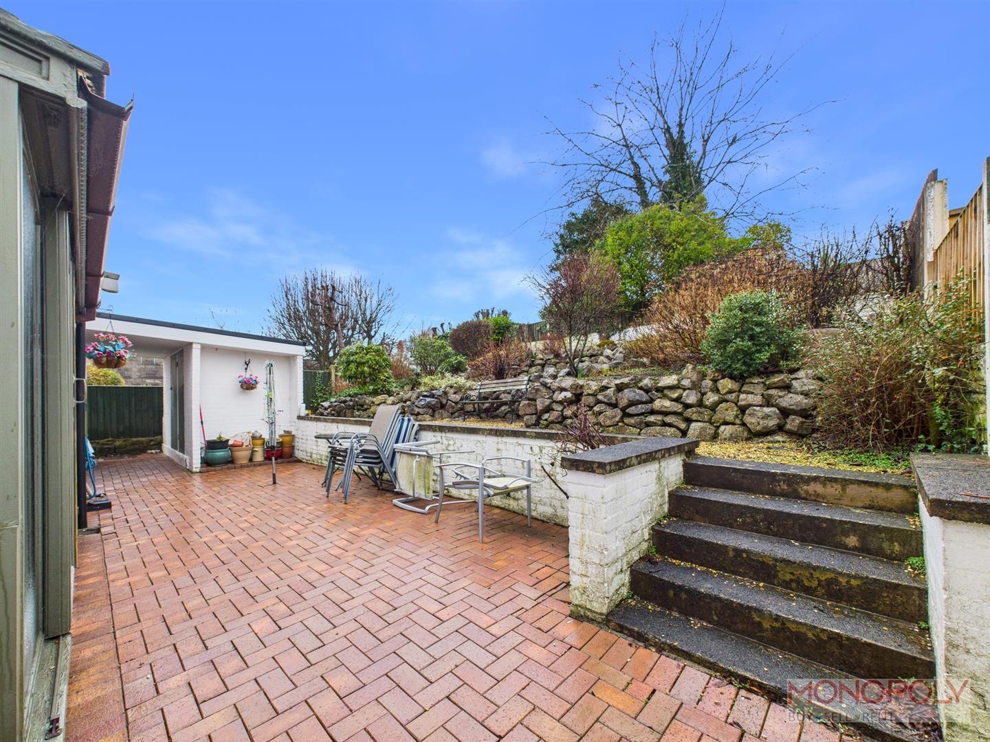 To the front, wrought iron double gates open onto a paved driveway providing off-road parking, complemented by a patio area to the front of the property. Gated access is available on both sides of the home, leading through to the rear garden. The rear garden has been attractively arranged and features a block-paved patio area, garden store and steps rising to a pleasant tiered garden. A gently sweeping gravel pathway leads through established shrubs and mature trees to the upper level, creating an attractive and well-structured outdoor space offering both privacy and interest.