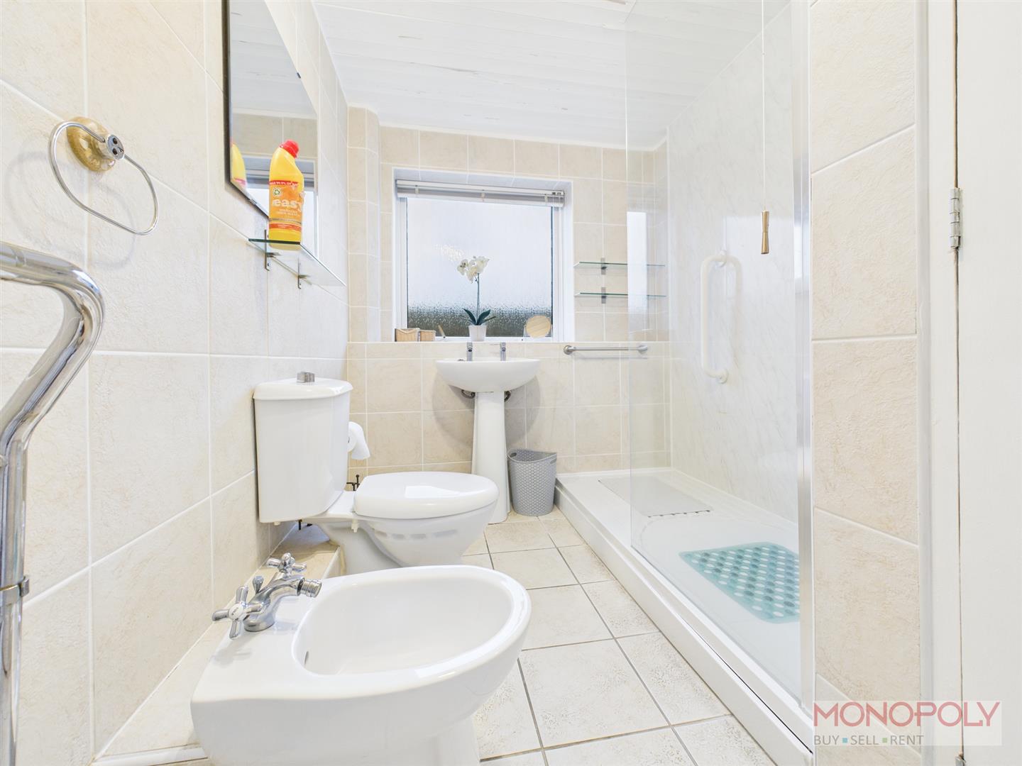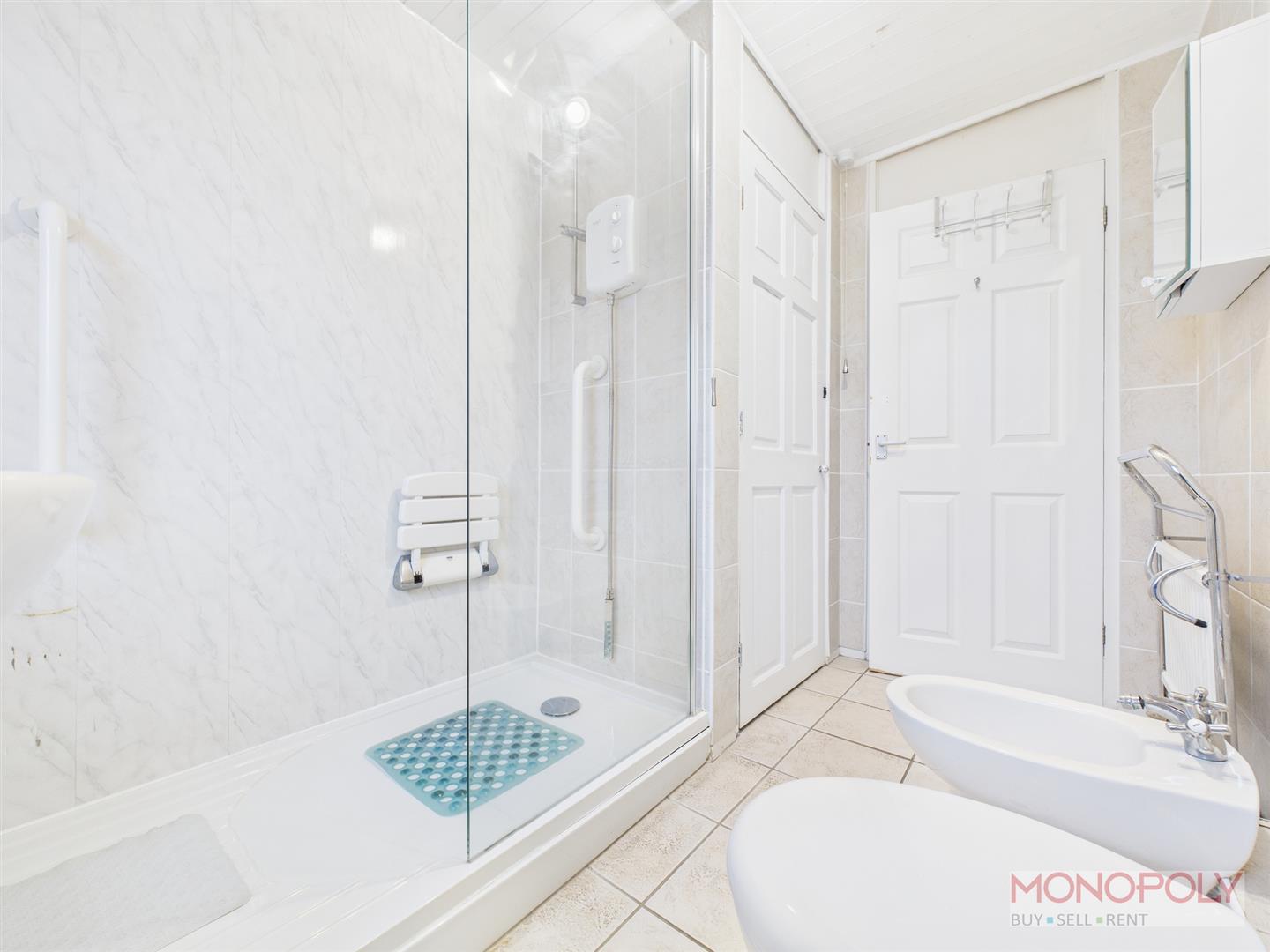 Four piece suite shower room comprising a low-level WC, wash hand pedestal basin, bidet, and a double walk-in shower cubicle with electric shower. Airing cupboard with shelving and solar powered hot water tank. Finished with traditional heated towel rail, access to loft, tiled floor, tiled walls and windowsill, ceiling light point and uPVC double glazed frosted window to the side elevation.