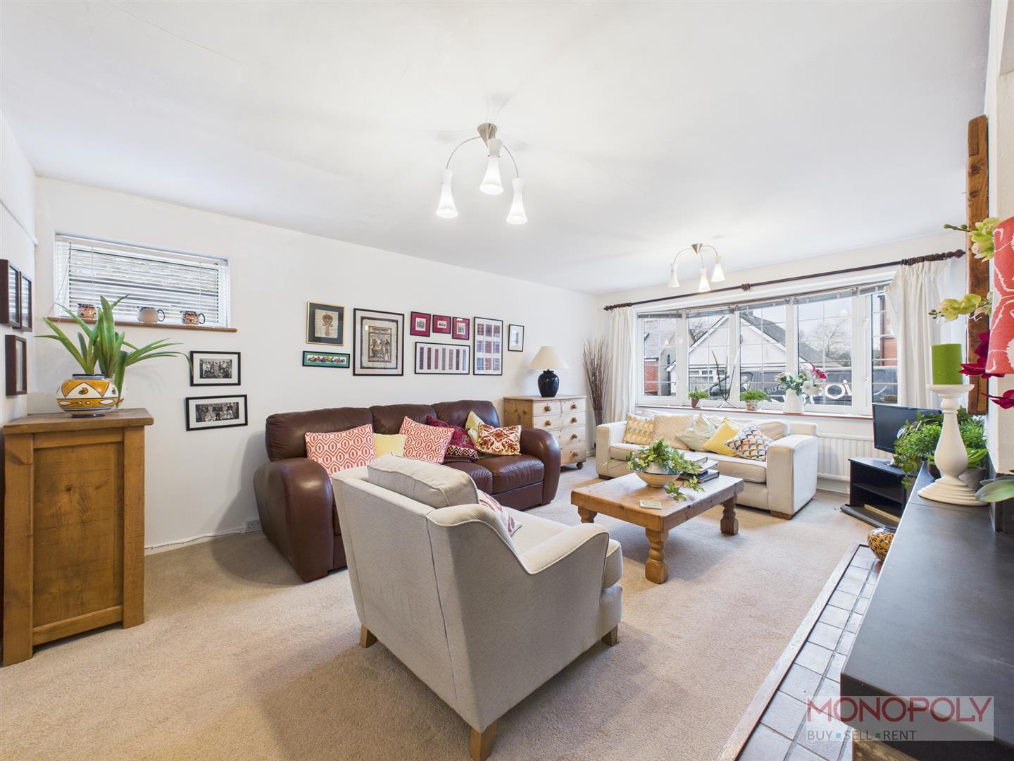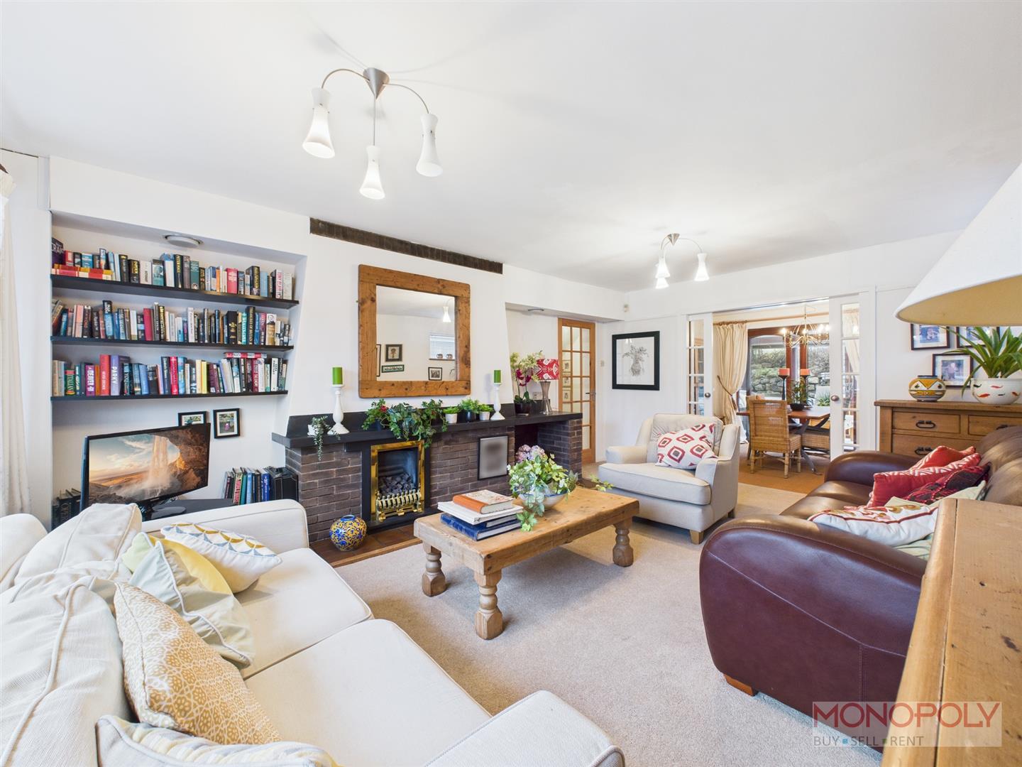 UPVC double glazed bay window to the front elevation and window to the side elevation. Gas fire set on a tiled hearth with brick surround and slate mantle shelving. Two ceiling light points, two alcove lights, carpet flooring, panelled radiator and glazed hardwood sliding doors into dining room.