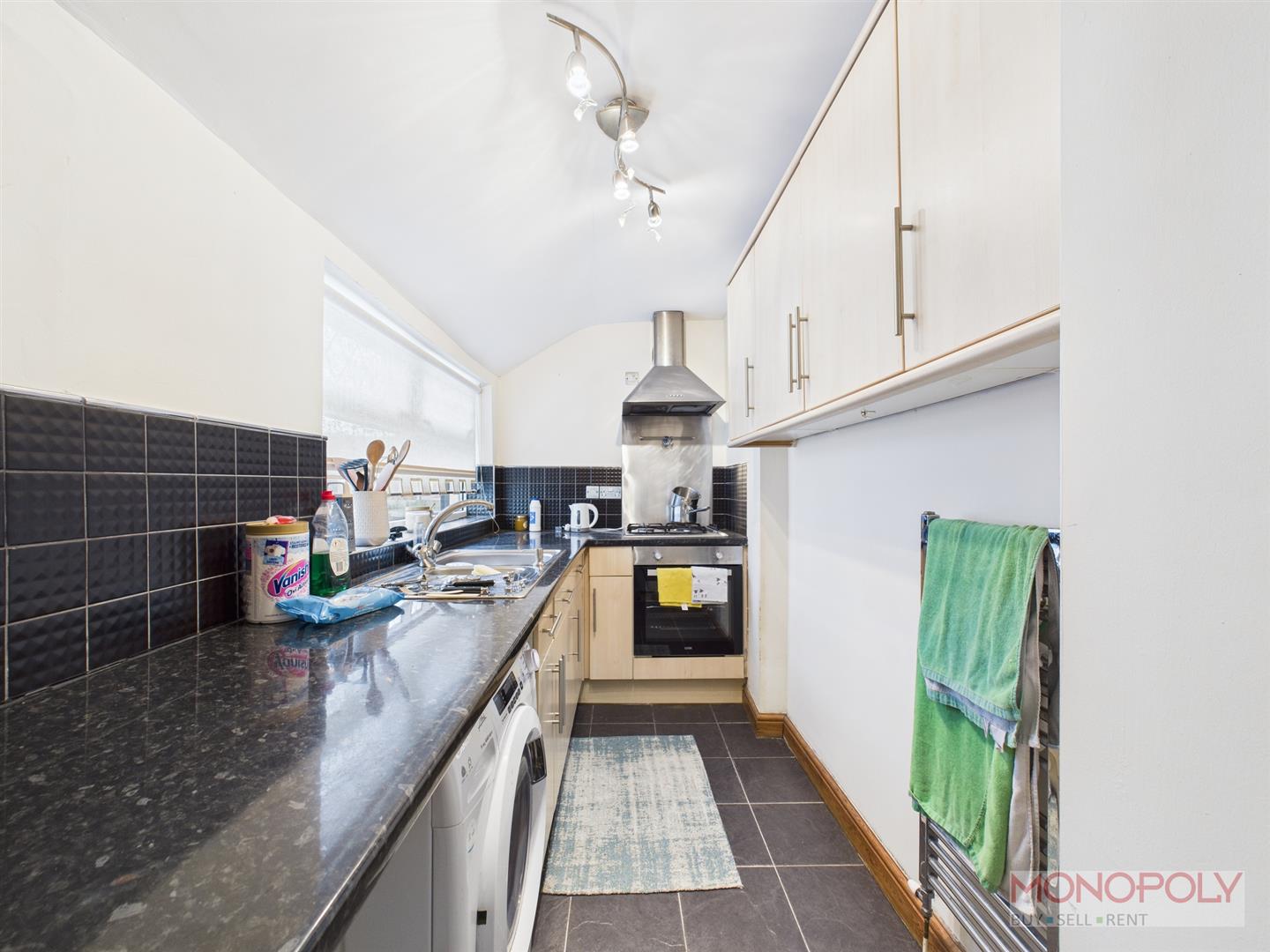 Fitted with matching wall, drawer and base units, working surface with inset 1 1/4 stainless steel sink and drainer, built in electric oven, 4 ring gas hob, stainless steel splash back, stainless steel extractor fan, washing machine (this will stay but is the tenants responsibility if anything goes wrong with it), tiled flooring, part tiled walls, double glazed window.