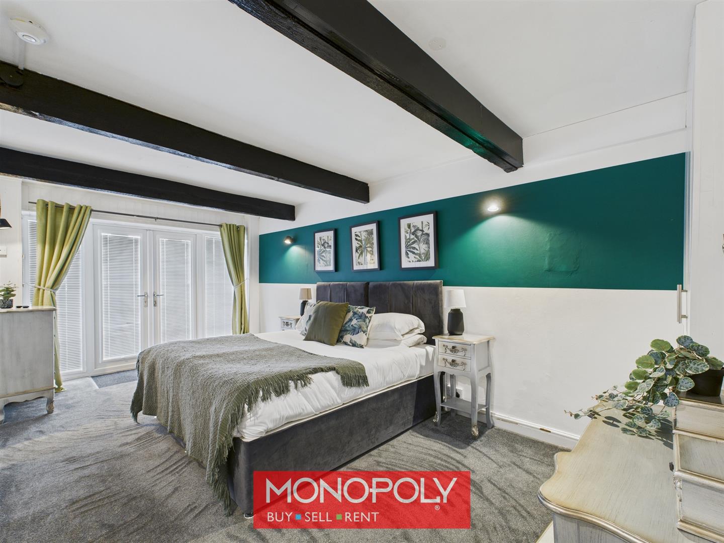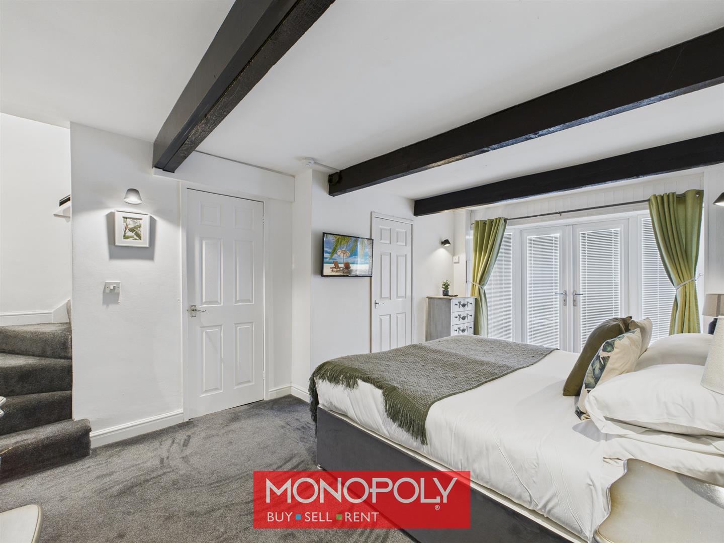 A generous double bedroom with exposed beams, carpeted floor, and French doors with glazed side panels—all fitted with Venetian blinds. Storage includes a cupboard beneath the stairs and a separate cupboard housing the gas combi boiler. Door to the shower room.