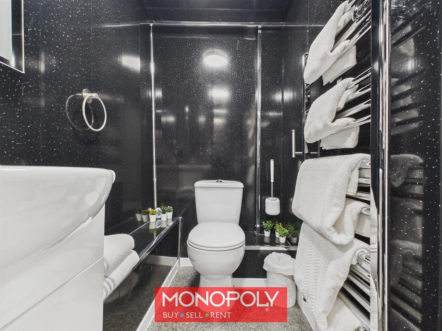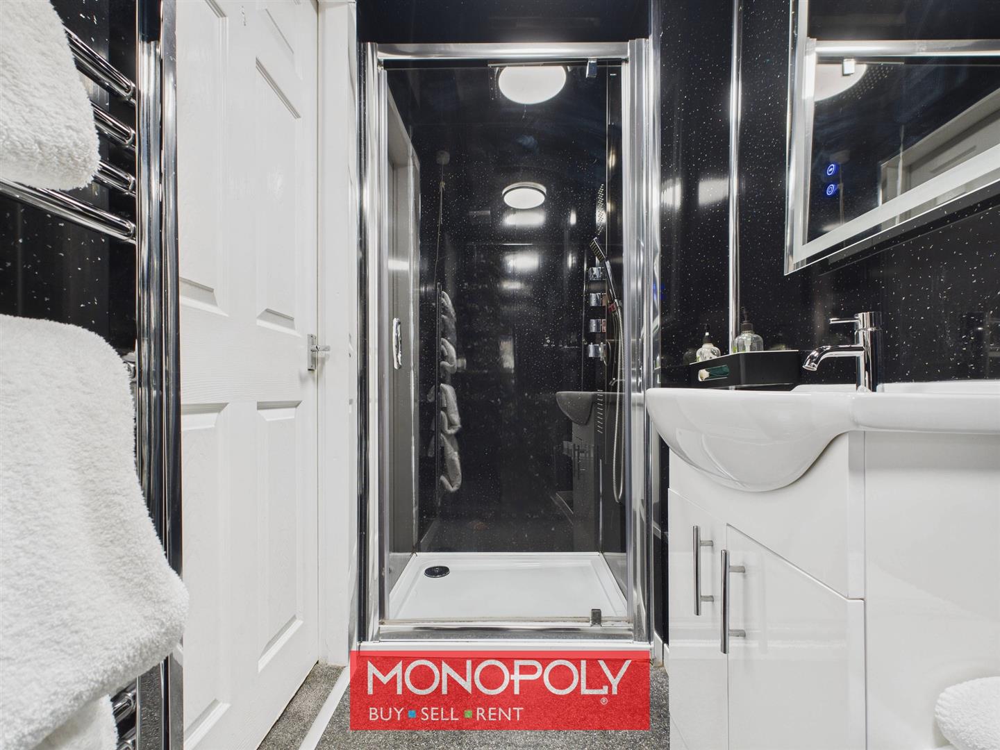 Fitted with a modern shower enclosure with thermostatic unit, vanity unit with sink, low-flush WC, UPVC sparkling wall panels, chrome towel rail, anti-mist LED-lit mirror, vinyl flooring, extractor fan, lighting, and housing for the boiler.