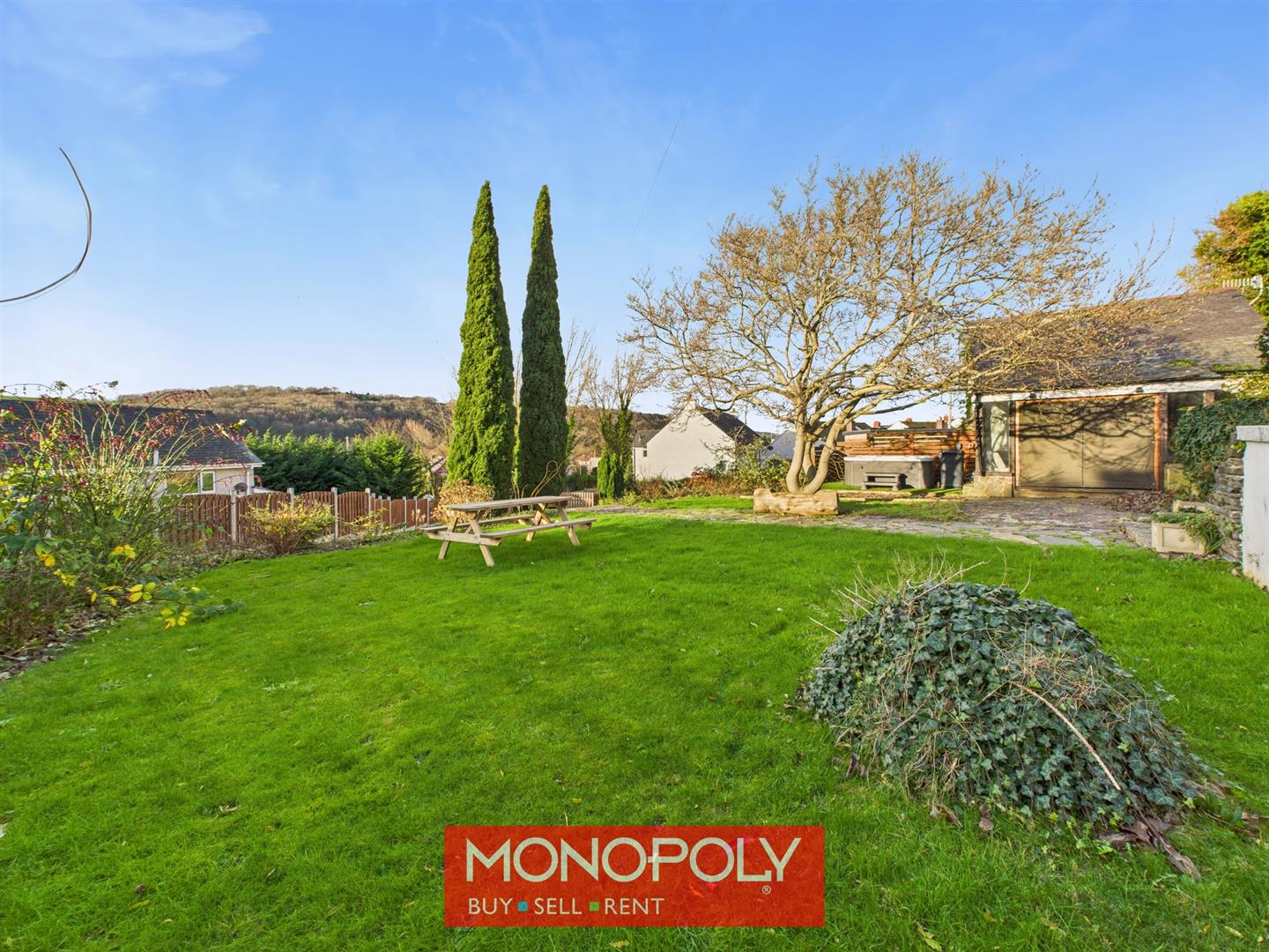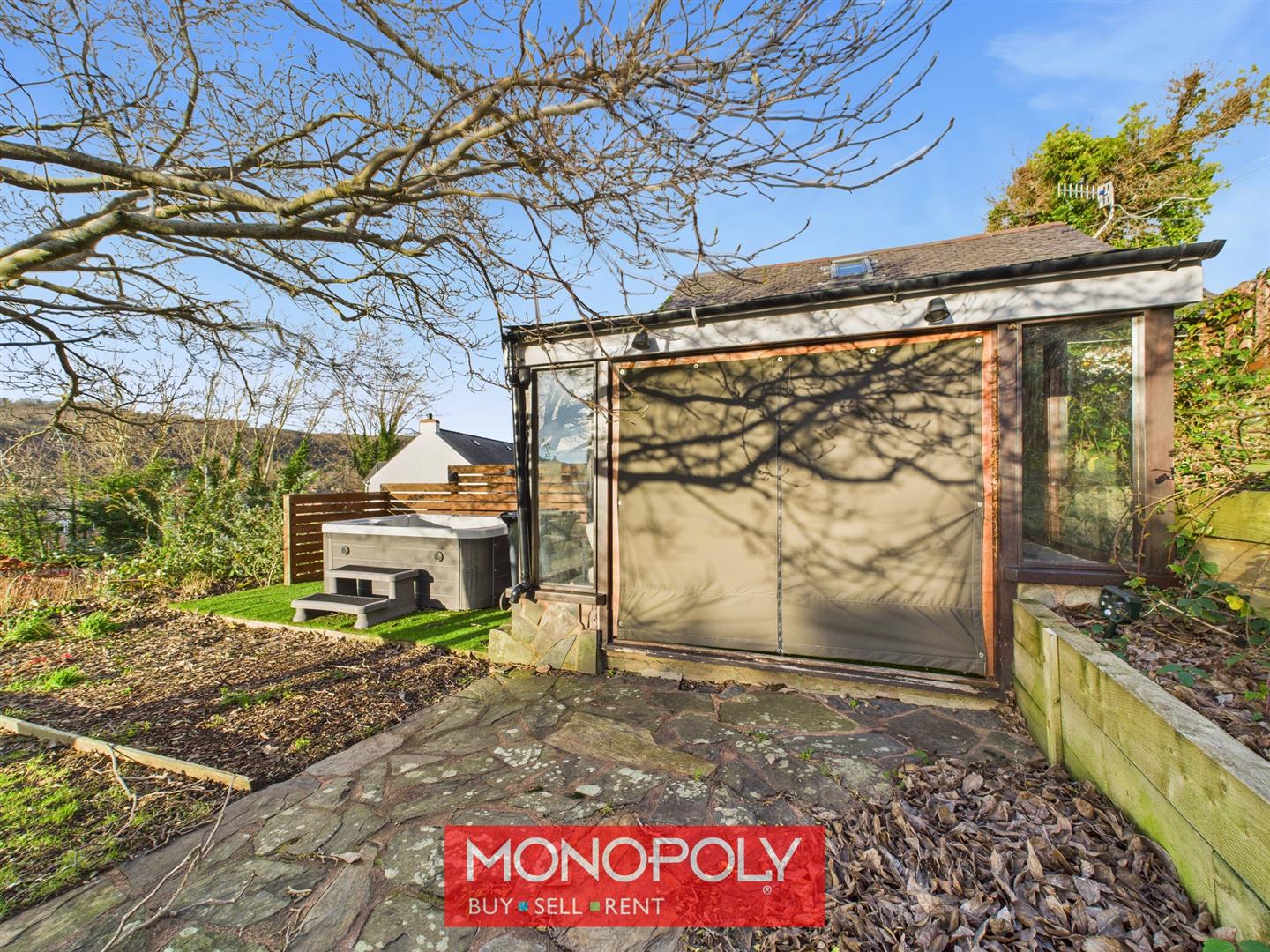 Accessed via a wooden gate, the garden offers a sweeping driveway, mostly lawned areas, mature trees, and a picturesque apple tree. Stone steps lead to a stone patio ideal for a hot tub. A wooden lean-to sun room/conservatory features astro flooring, power, lighting, single-glazed windows, wall-mounted TV point, and a zip-up tarpaulin door—perfect for enjoying the wonderful views.