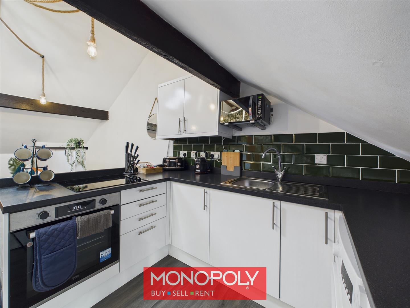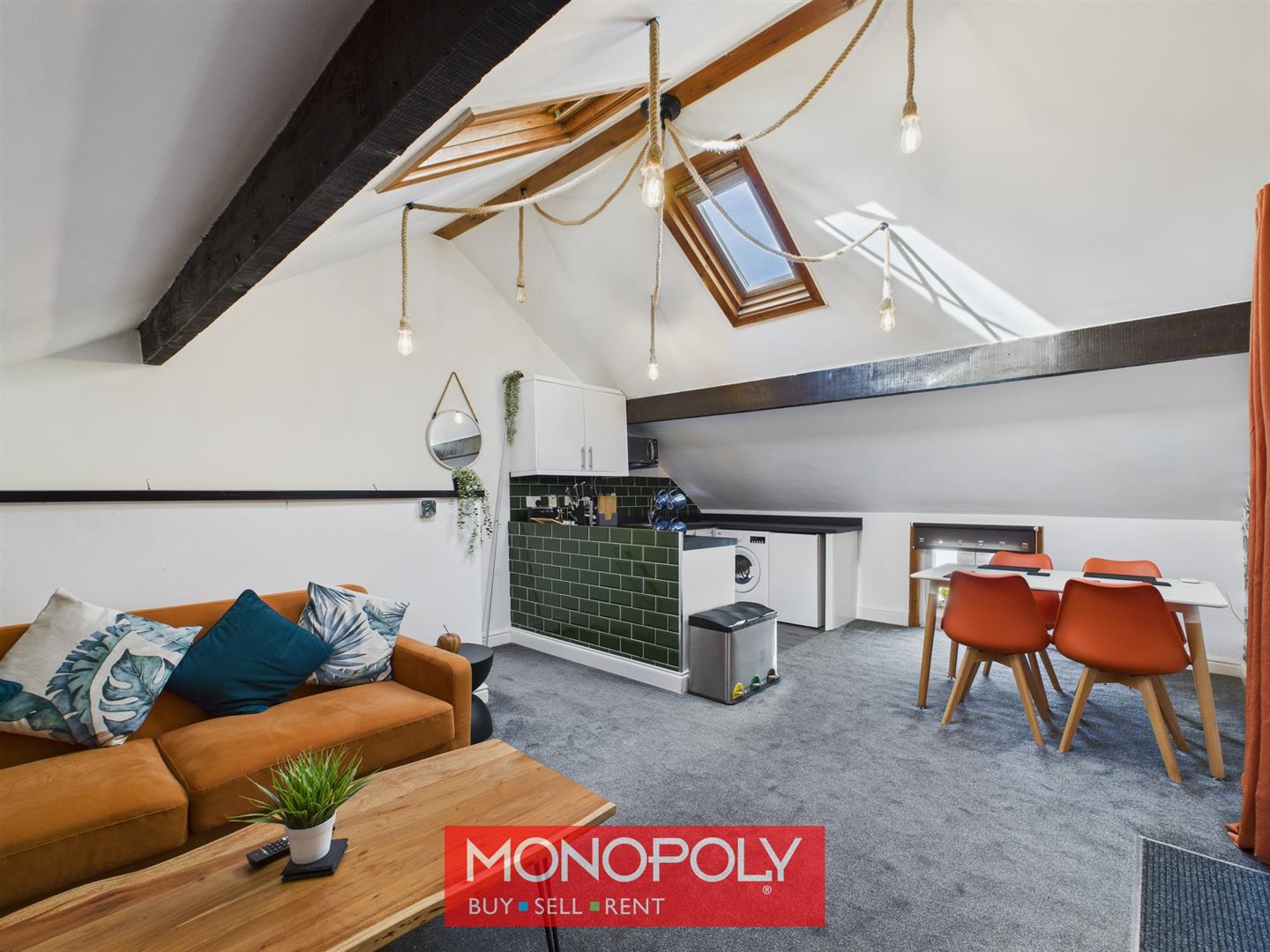 A charming and thoughtfully designed upside-down layout. The main living area features French doors, carpeted lounge area and vinyl flooring to the kitchen. A wall-mounted gas fire, radiator, and A-pex roof with exposed beams and two skylights create a warm and inviting atmosphere. Unique feature rope lights accent the ceiling. The modern fitted kitchen includes an electric oven and hob, stainless steel sink, and space for both an under-counter fridge and washing machine. A low-level window adds further character. Stairs descend to the bedroom.