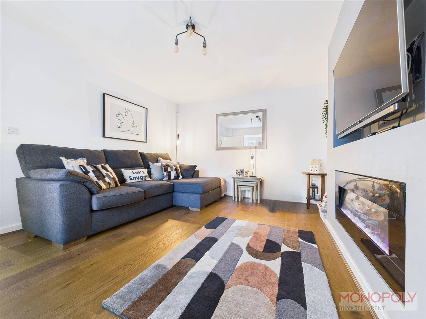 Featuring a media wall with electric fire and alcove for television, box style uPVC double glazed window to front with blinds, radiator, ceiling light point and wooden laminate flooring.
