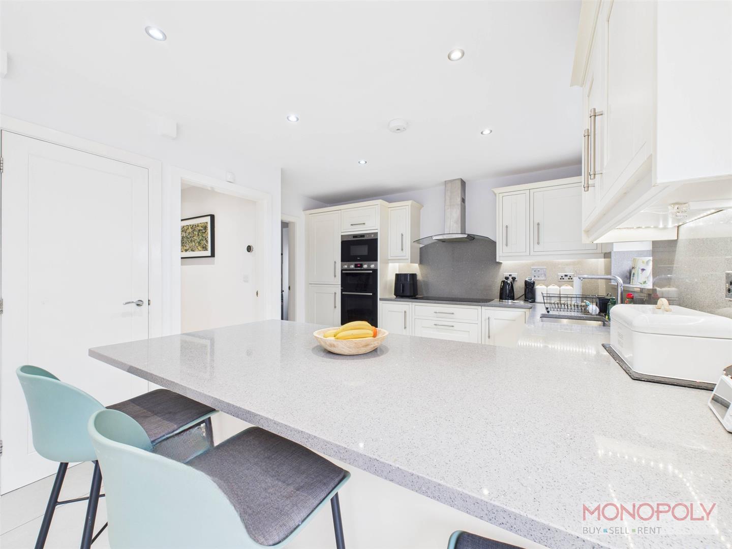 A contemporary kitchen featuring a range of wall, drawer and base units with quartz work surface over. Integrated appliances to include eye-level electric cooker and grill with additional microwave oven above, fridge-freezer, 5 ring induction hob with extractor over, plate warmer, dishwasher and wine cooler 1.5 inset stainless steel sink unit with mixer tap with a boiling water feature. The kitchen is finished with Quartz tiled splash backs, kick-board lighting lighting in cupboards, under-cabinet lighting and tiled flooring. There is a door off to a separate utility, and a breakfast bar area which runs seamlessly into the open plan dining area.