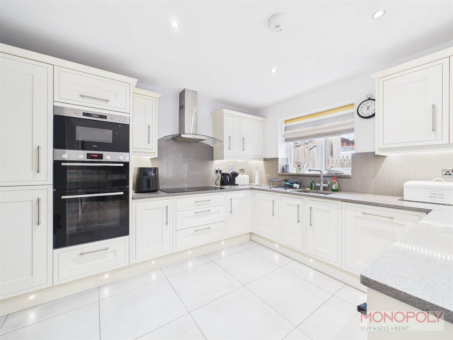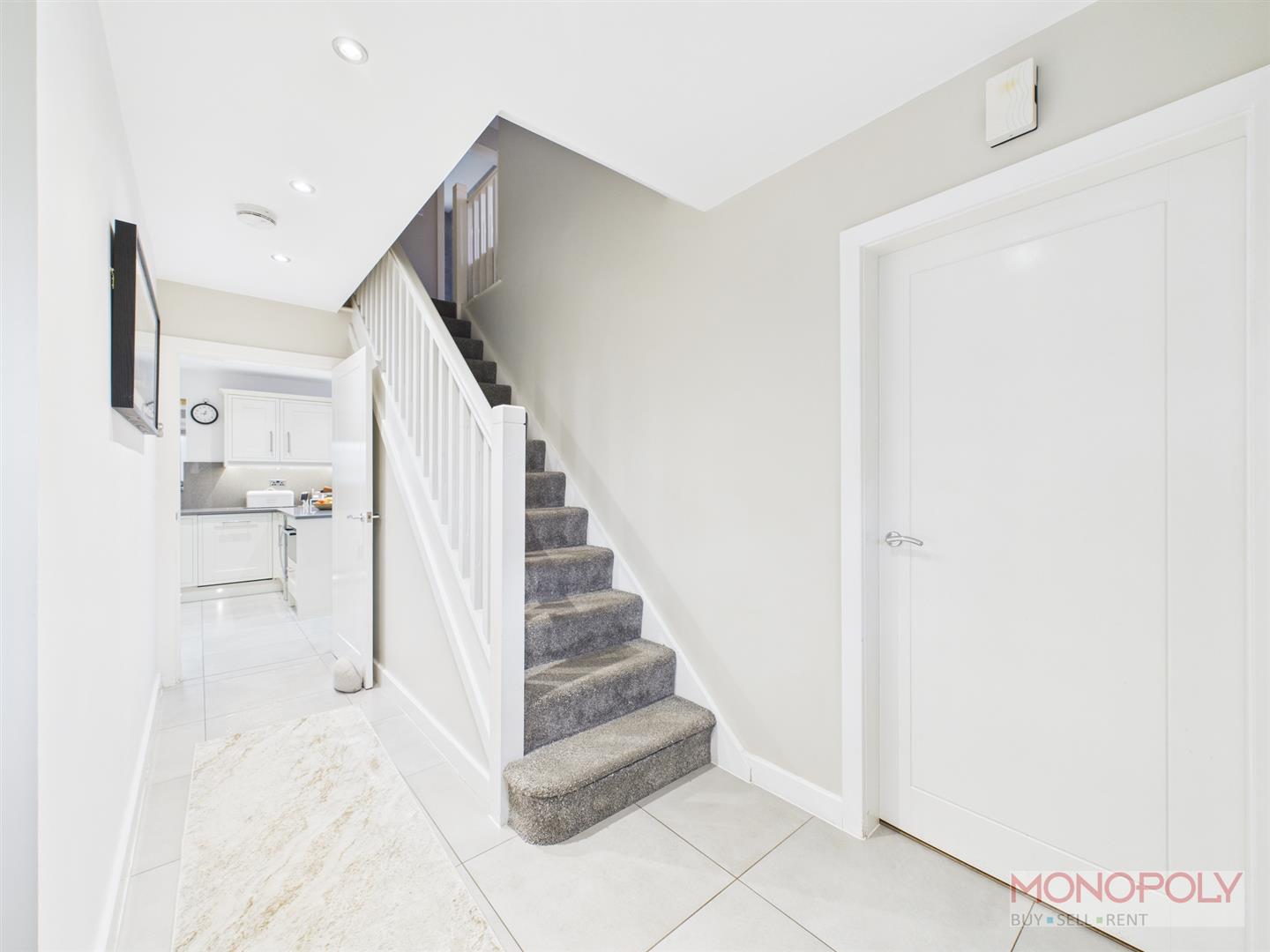 Composite door leads into welcoming entrance hall with uPVC double glazed window to front. There is a media cupboard allowing for wireless connections throughout the home. The room is finished with panelled radiator, tiled flooring, recessed LED lighting, stairs to first floor, doors into downstairs WC, living room and kitchen.