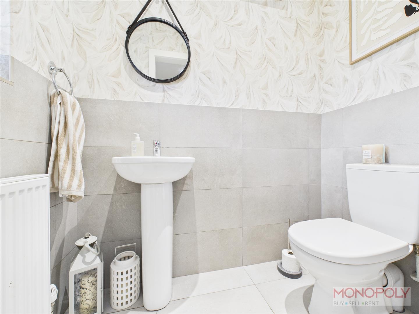 UPVC double glazed frosted window to the front elevation. Two piece suite comprising low-level WC and pedestal wash hand basin. Finished with tiled flooring, part-tiled walls, radiator, recessed LED lighting.
