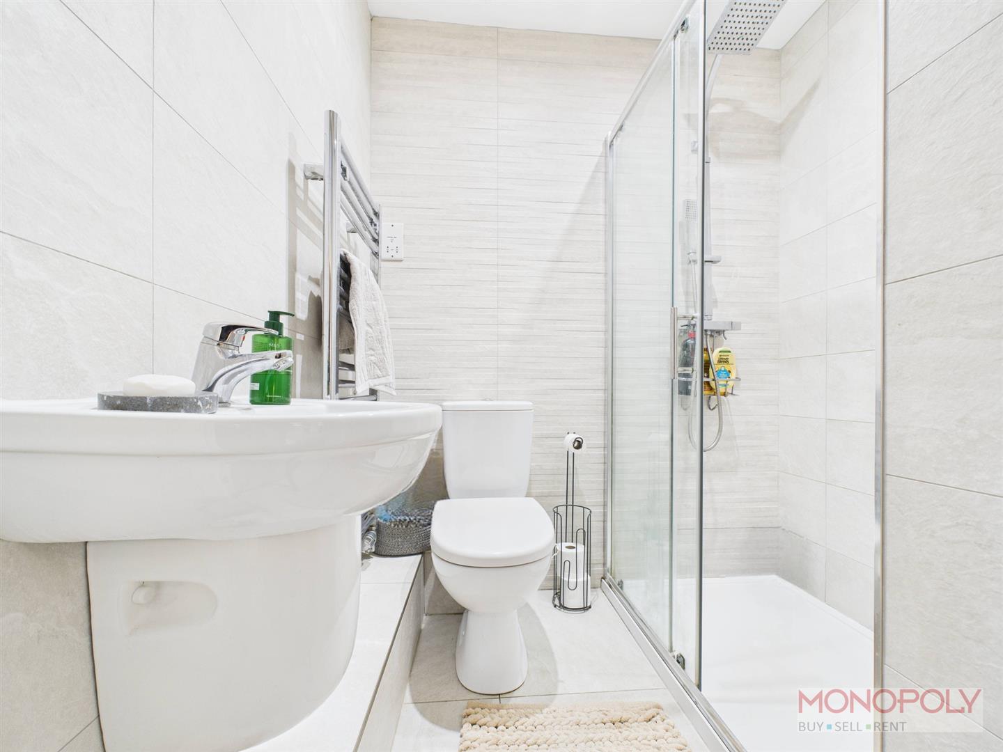 Three piece suite housing a dual hose shower, low-level WC and wash hand basin. Fully tiled walls and flooring, shaving point, heated towel rail, extractor and recessed LED lighting.