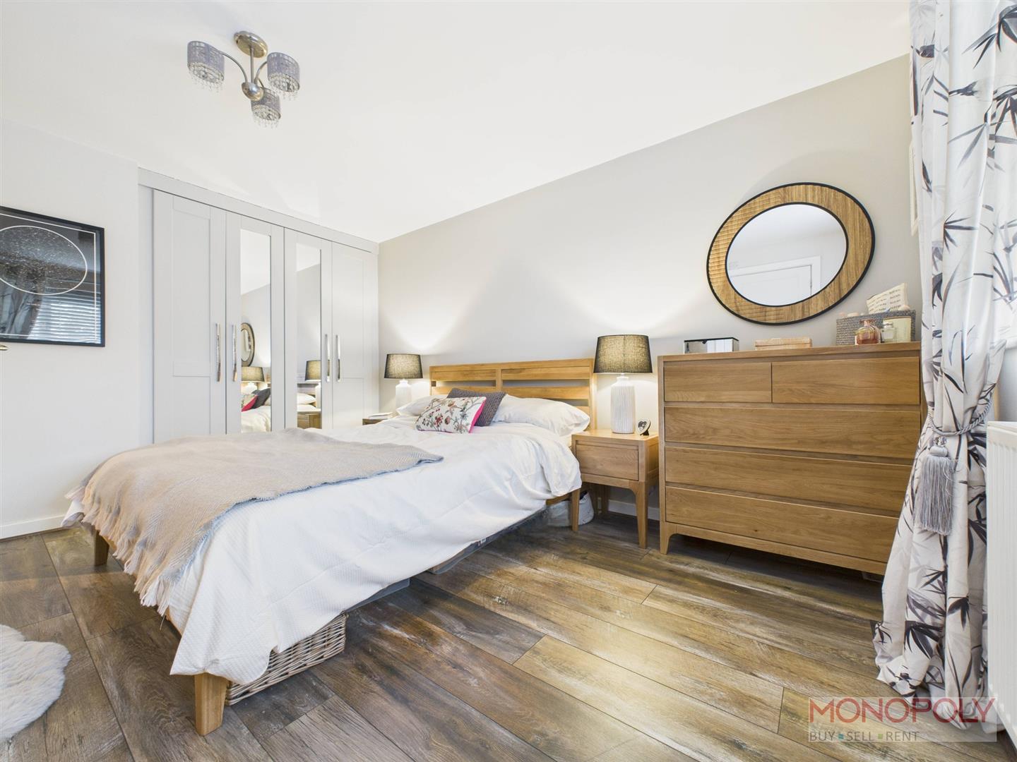 UPVC double glazed window to the front elevation with blinds, wooden laminate flooring, built-in wardrobes, ceiling light point and radiator. Door into en-suite.