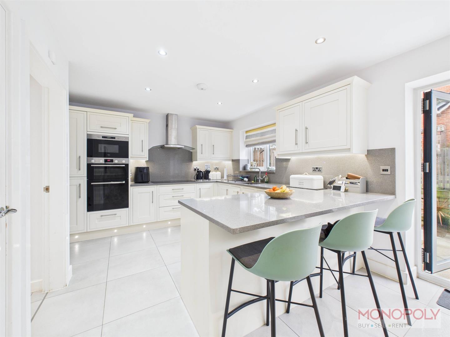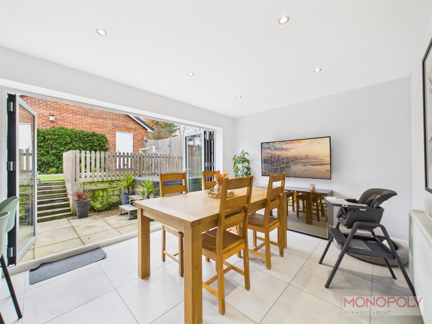 The dining area has space for a dining table with bi-fold doors to the garden area. The room is finished with radiator, recessed LED lighting and door into under-stairs storage cupboard with a light.