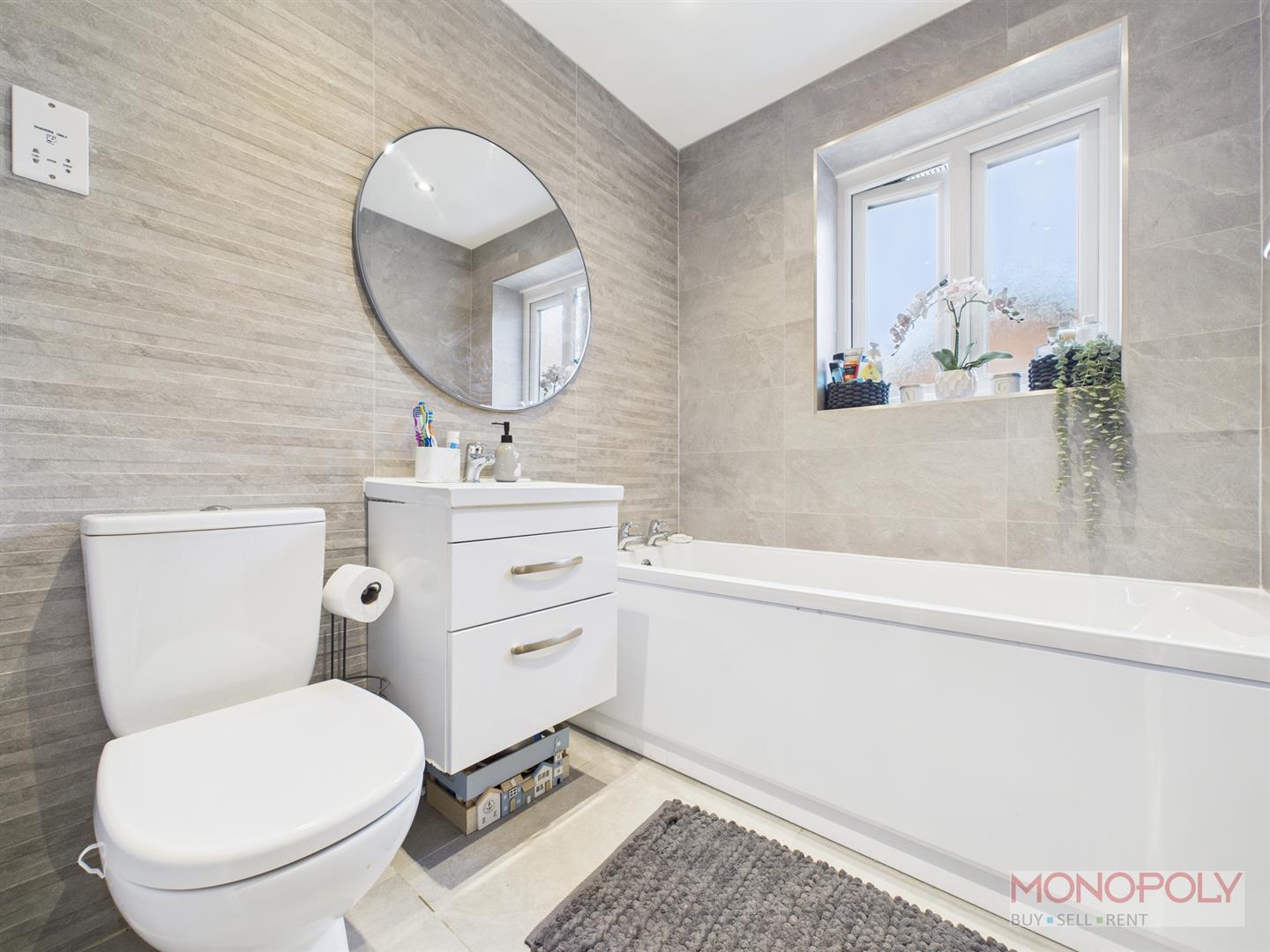 A contemporary three piece suite comprising a low-level WC, panelled bath and wash hand basin set in a vanity unit with drawers. Fully tiled walls and flooring, extractor, heated towel rail, recessed LED lighting and uPVC double glazed frosted window to the rear.