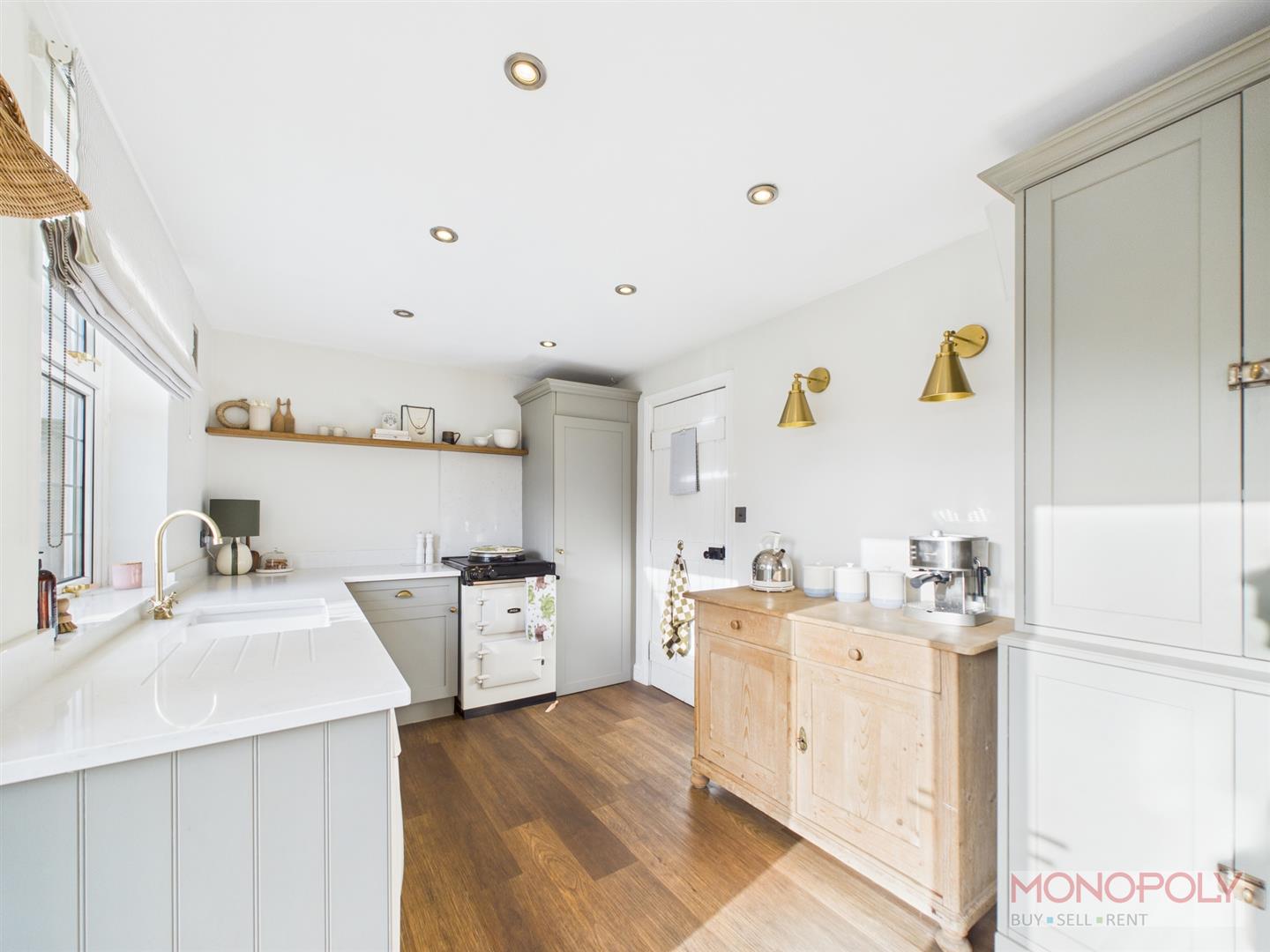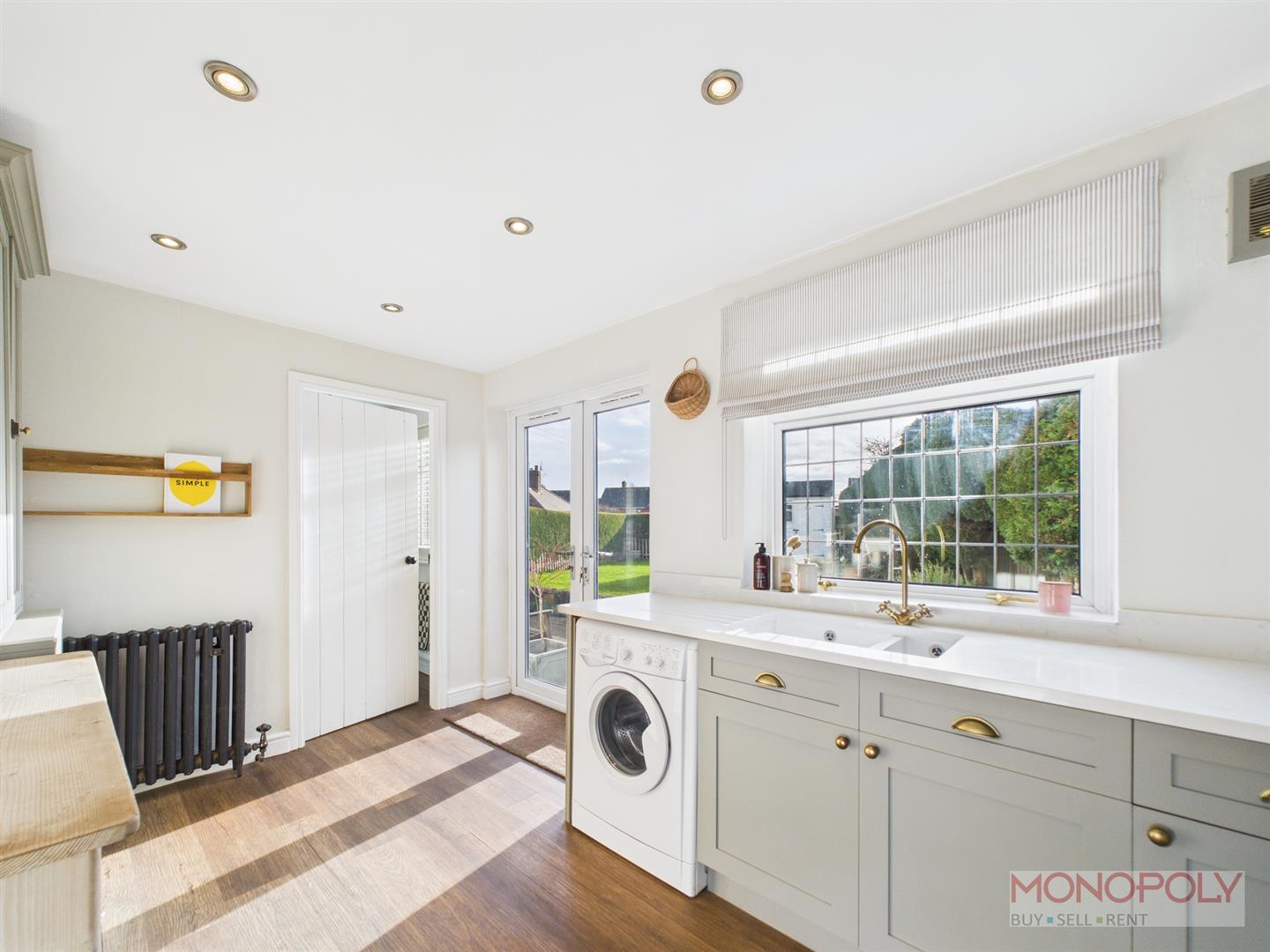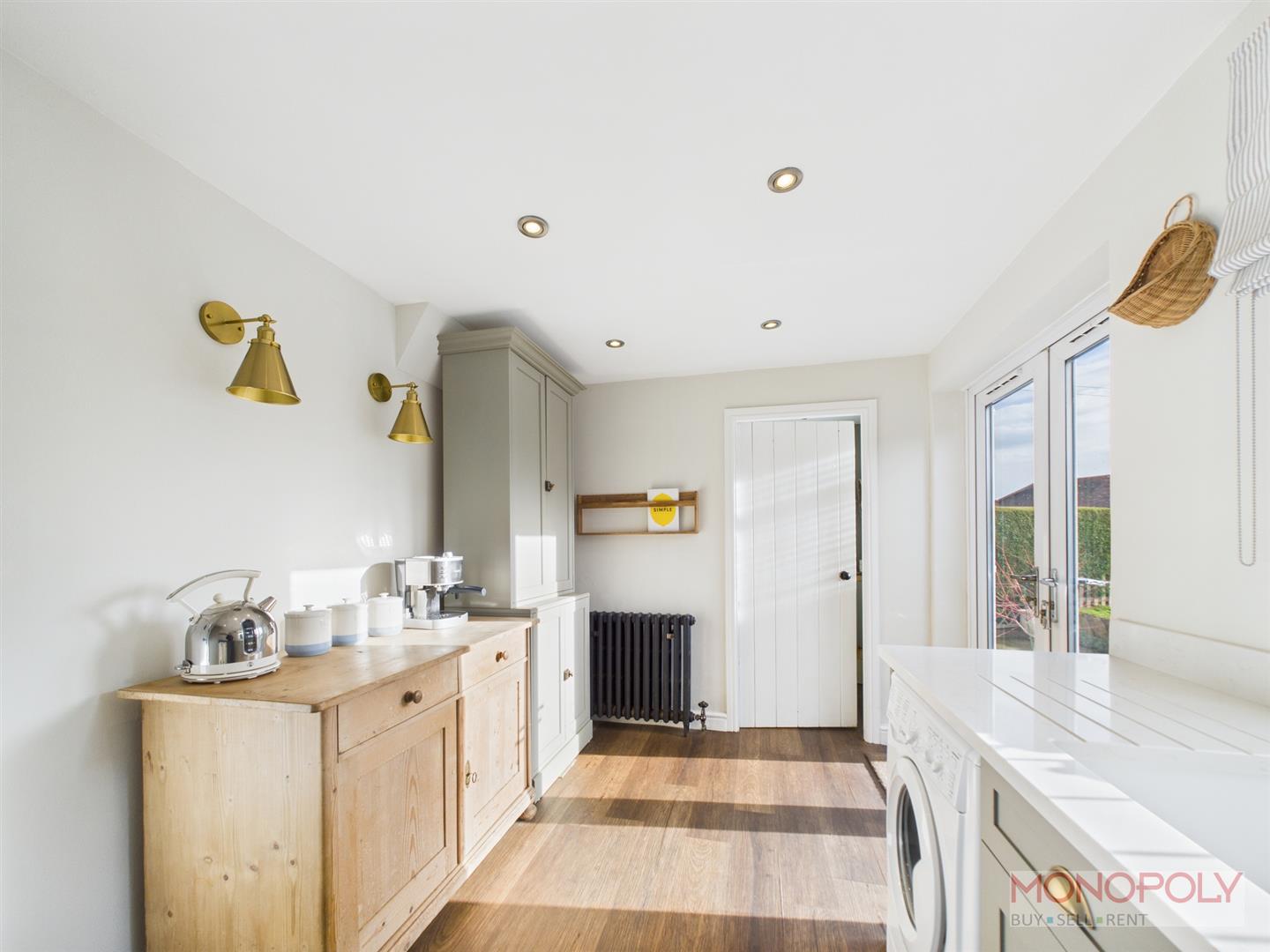 Superbly appointed with attractive quartz work surfaces, units under and larger built in storage units, plumbing for a washing machine, double glazed window, double glazed french doors off to the rear garden, wood effect flooring.