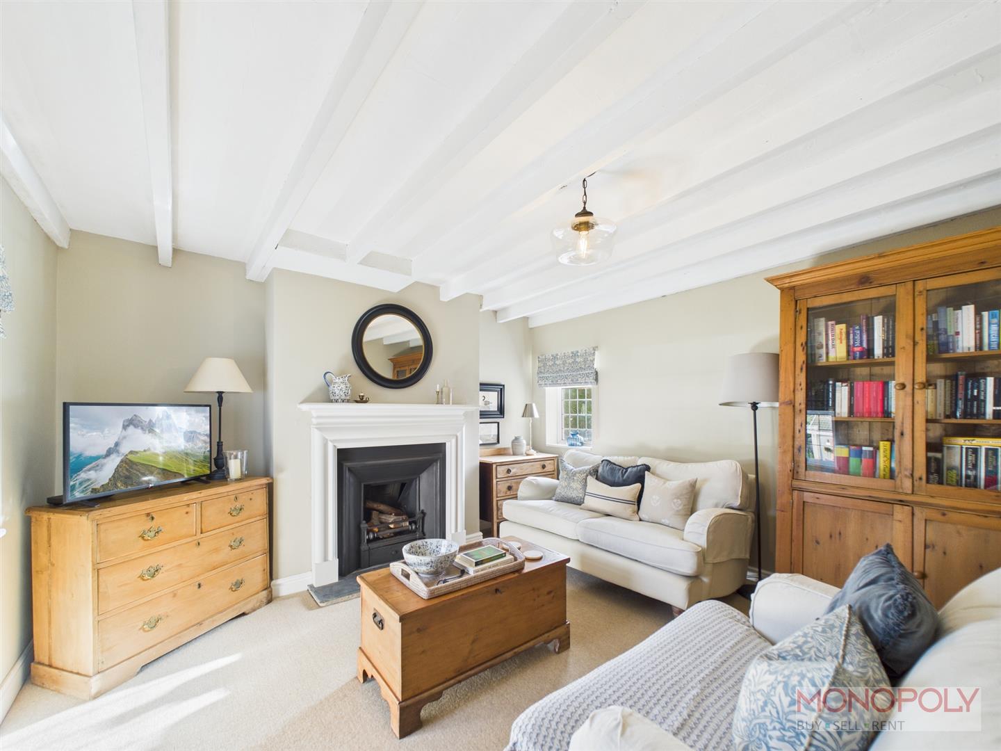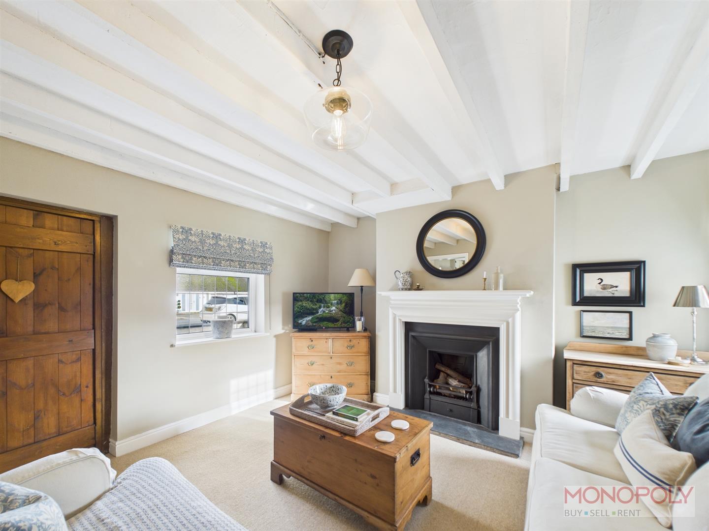 A stunning room, full of character and charm with attractive feature open fire with slate hearth and timber mantel, 2 double glazed windows, carpeted flooring, beamed ceiling.