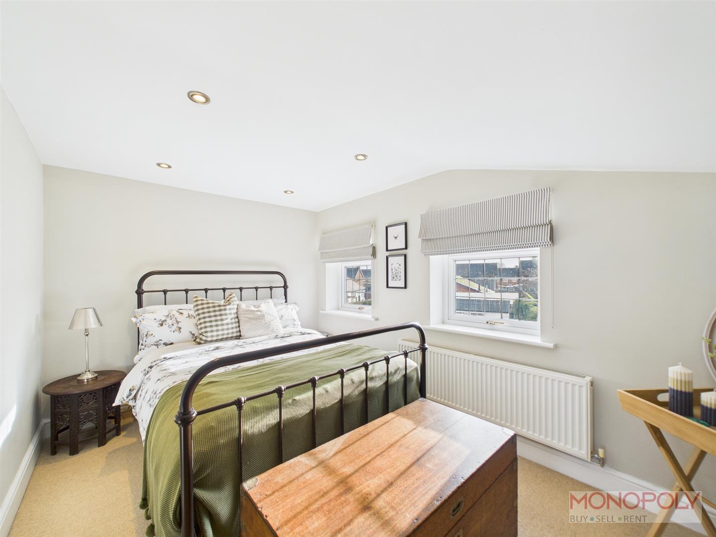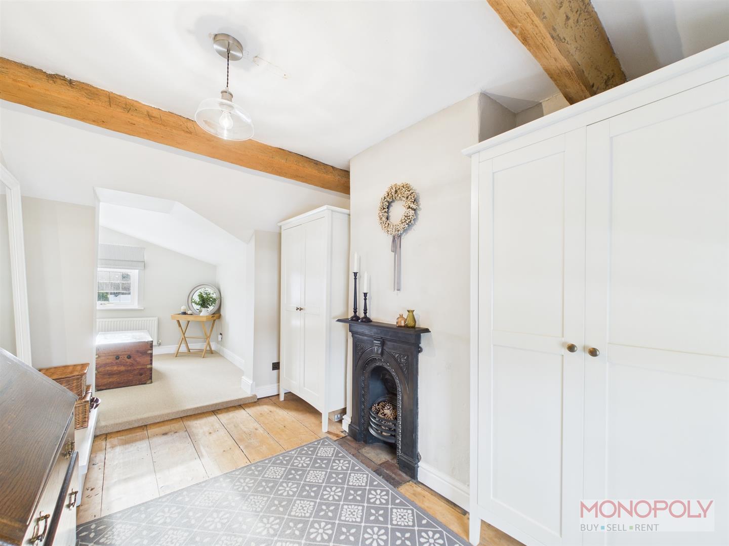 Separated into two sections with one area ideal for use as a dressing room with feature fireplace, beamed ceiling, thick exposed wood flooring, double glazed window to the front, opening into the bedroom with 2 double glazed windows, carpeted flooring.