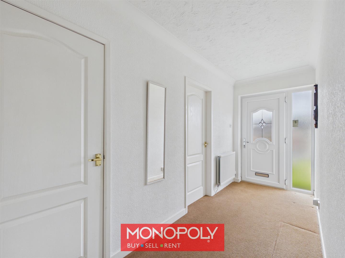 L-shaped hall with uPVC entrance door and glazed side panel for natural light. Carpeted, with radiator, loft access and doors to lounge, dining room, kitchen, bedrooms and family bathroom.