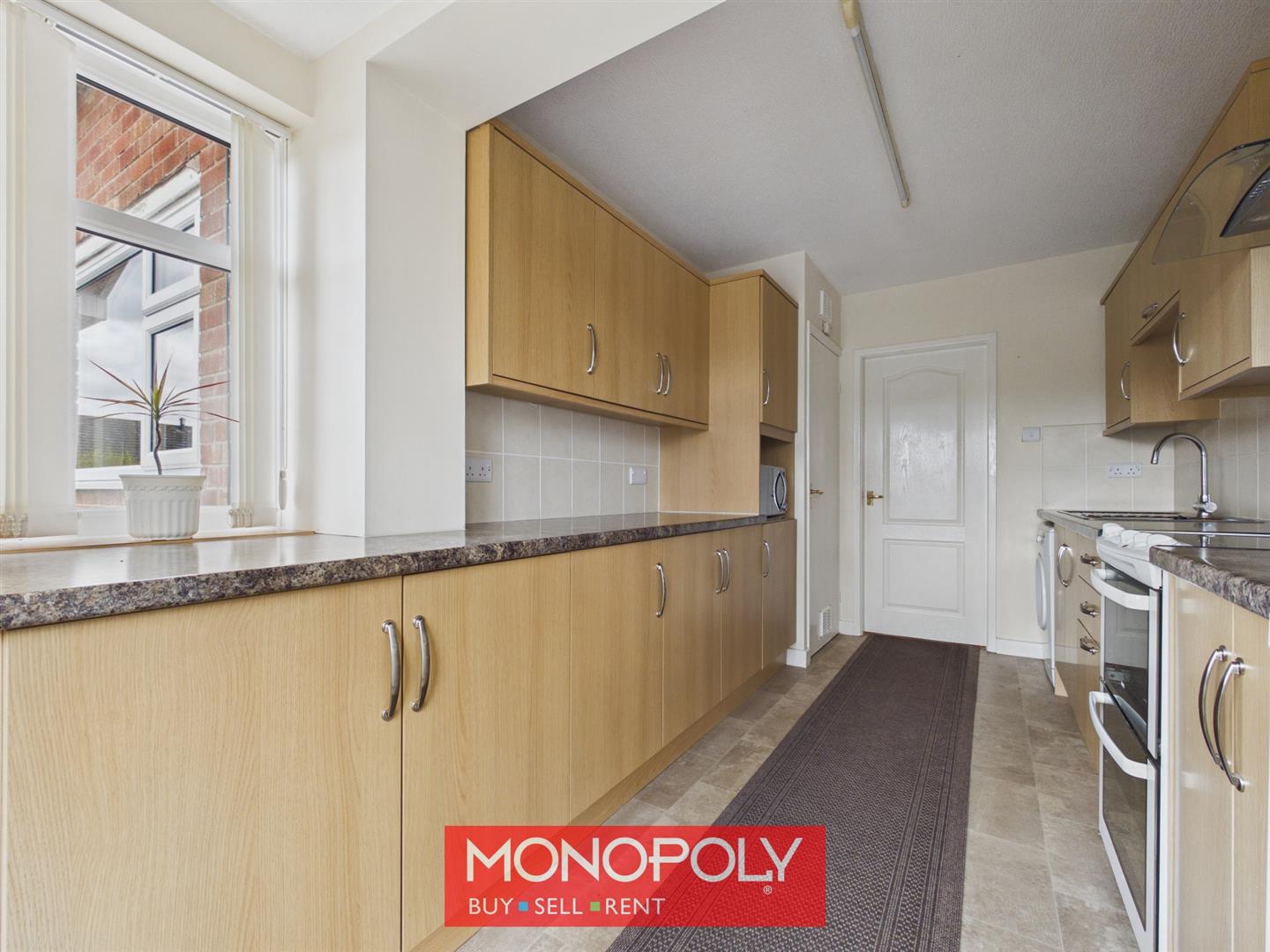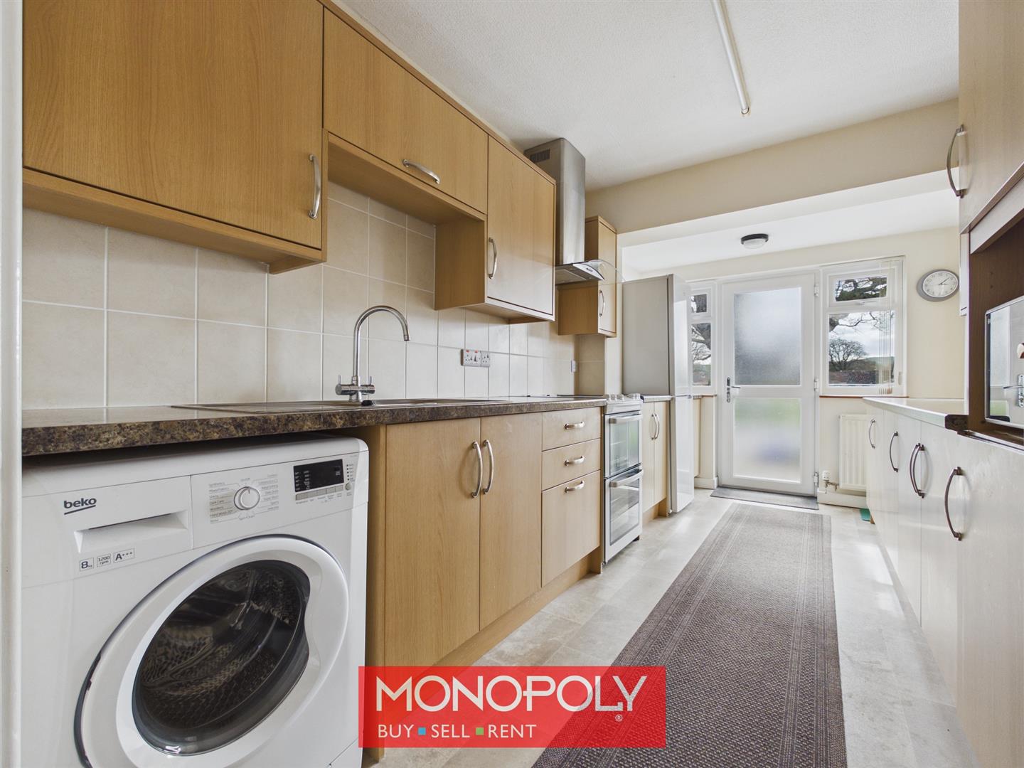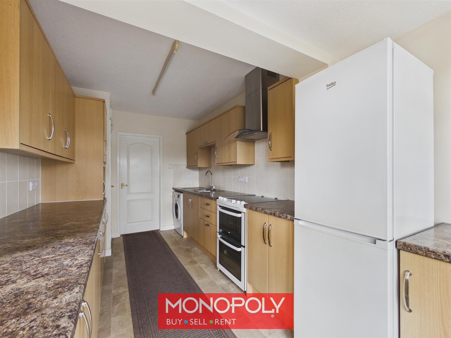 Practical galley layout fitted with beech-effect wall and base units and granite-effect laminate worktops. 1.5-bowl stainless-steel sink with drainer, extractor hood, vinyl flooring and uPVC double-glazed door with side windows to outside. Appliance spaces for washing machine, electric cooker and tall fridge-freezer. Former airing cupboard houses the Ideal combi boiler, with additional radiator to help air clothing. Bright room with a further radiator.