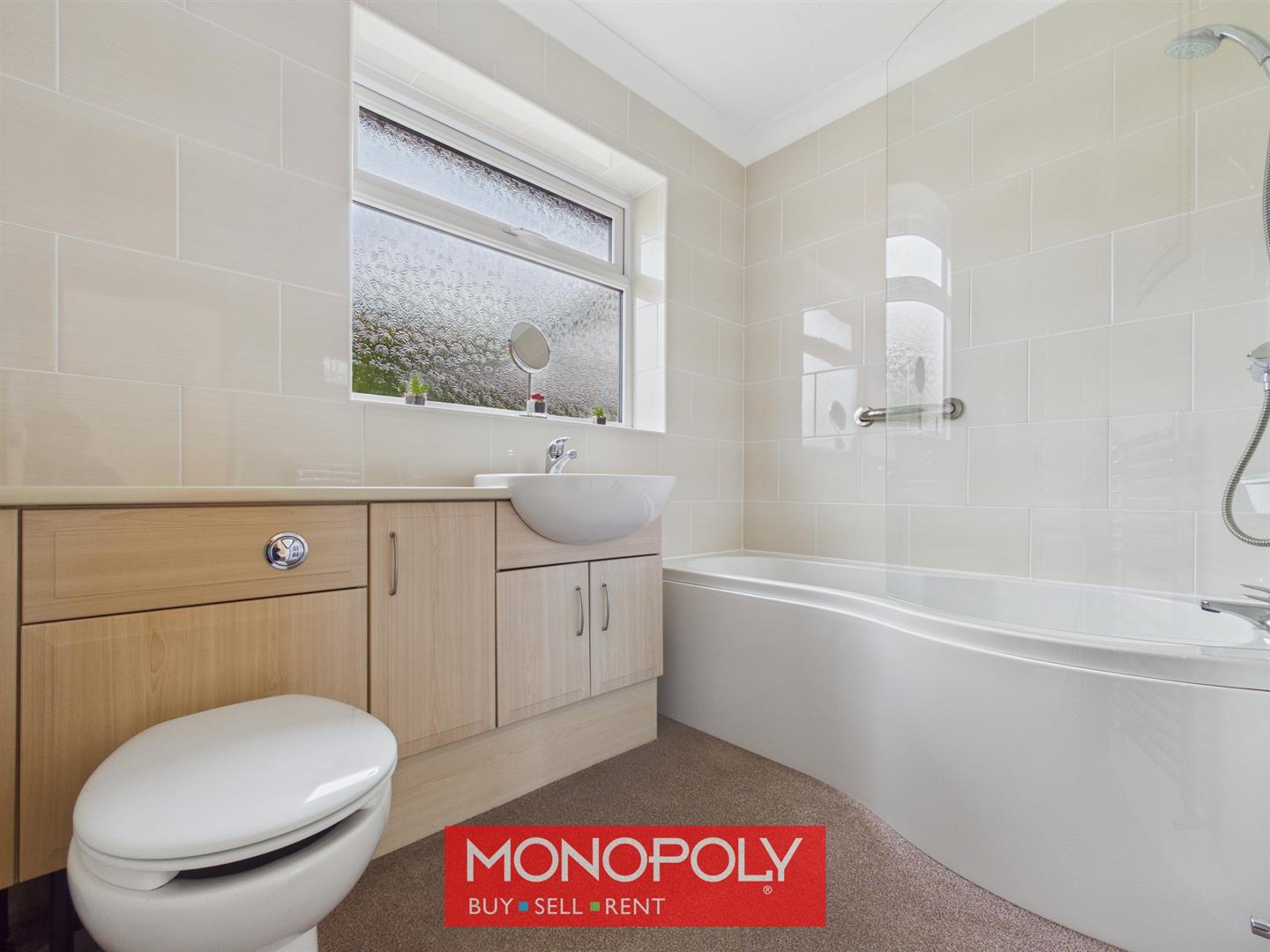 Well appointed with vanity unit incorporating low-flush WC and wash basin, P-shaped bath with thermostatic shower and mixer tap, fully tiled walls, uPVC double-glazed privacy window, extractor fan, chrome ladder radiator and bevel-edged wall mirror. Carpeted.