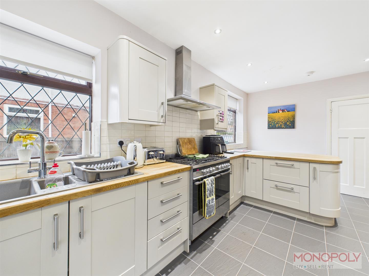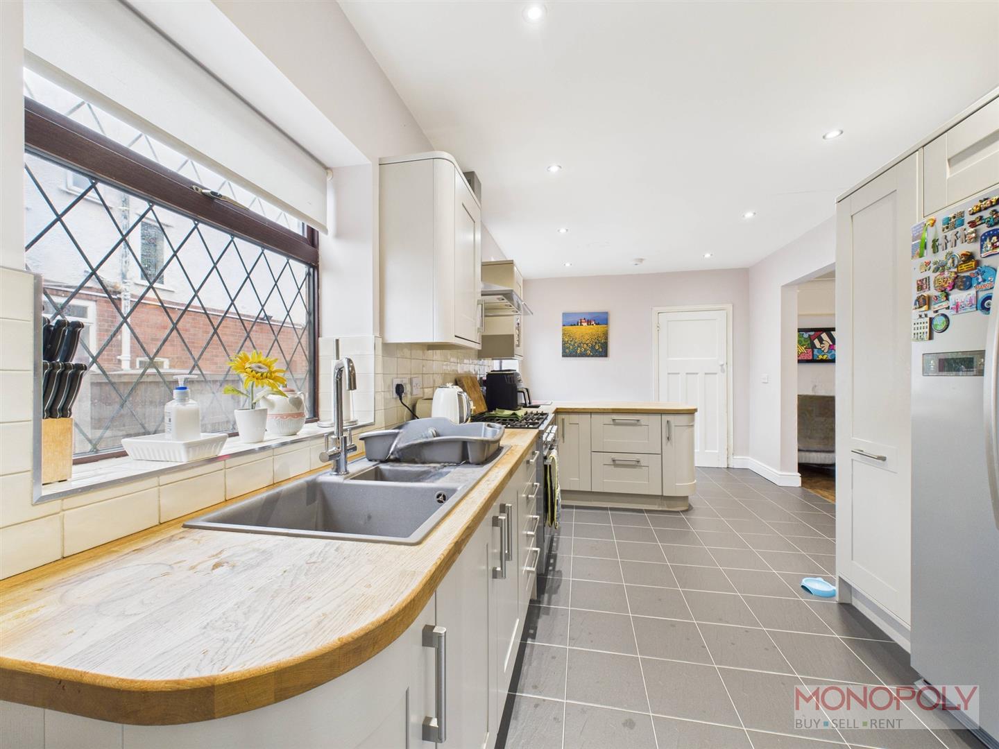 Fitted with a range of matching wall, drawer and base units, solid wood work surface incorporating a breakfast bar area, inset 1 1/4 sink and drainer, space for a fridge/freezer, freestanding cooker with dual electric oven and 5 ring gas hob, tiled flooring, space for a large fridge/freezer, 2 double glazed windows.