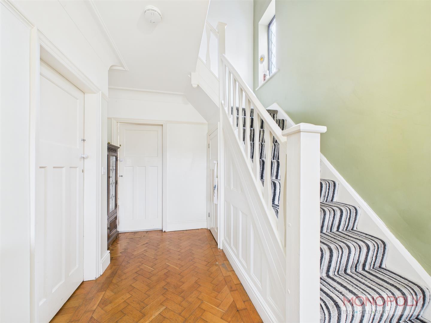 With original parquet flooring, stairs off to the first floor, door to an under stairs storage cupboard.
