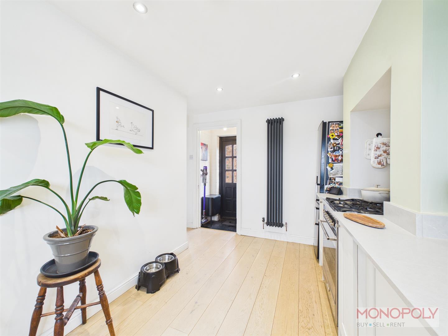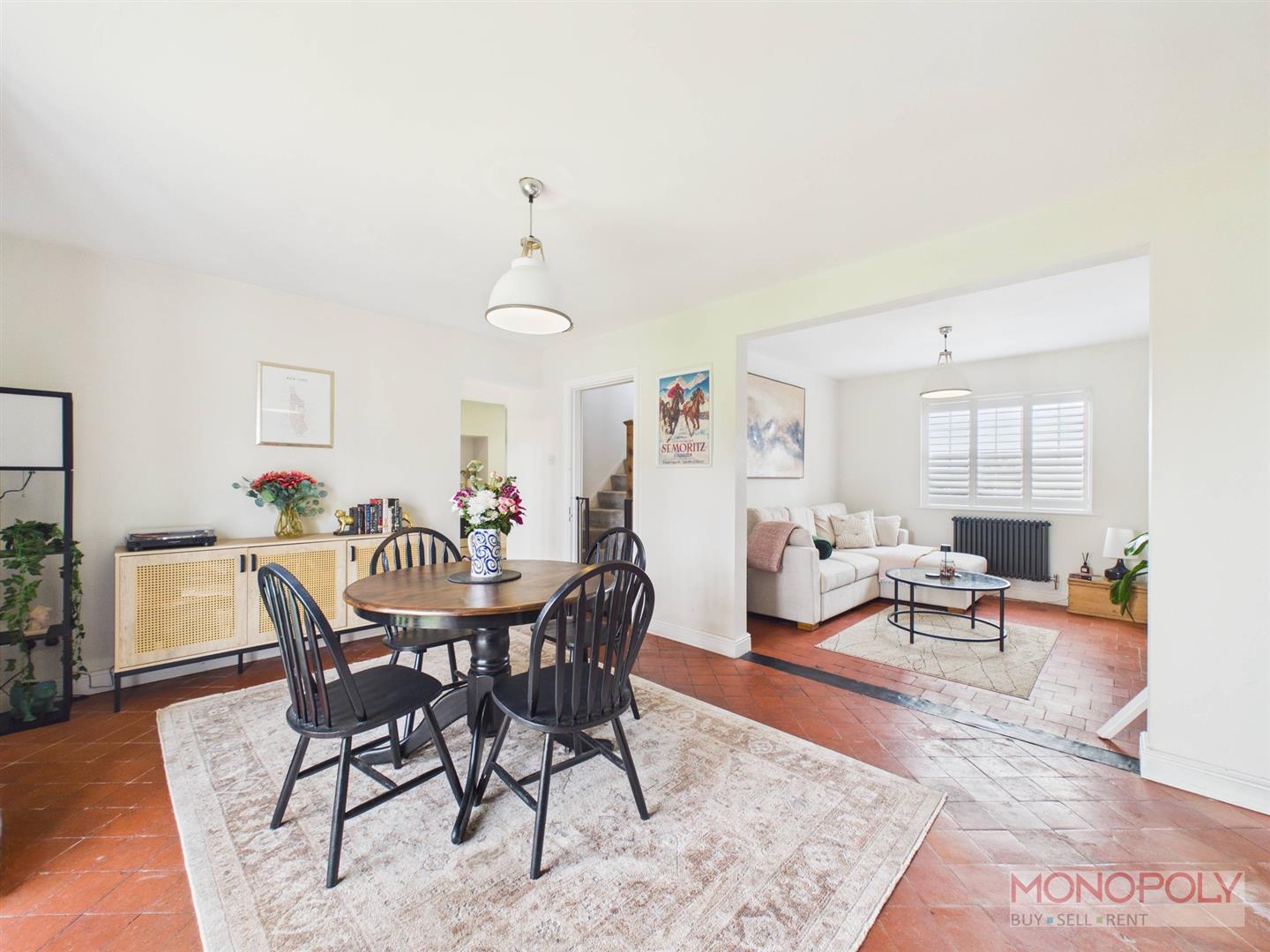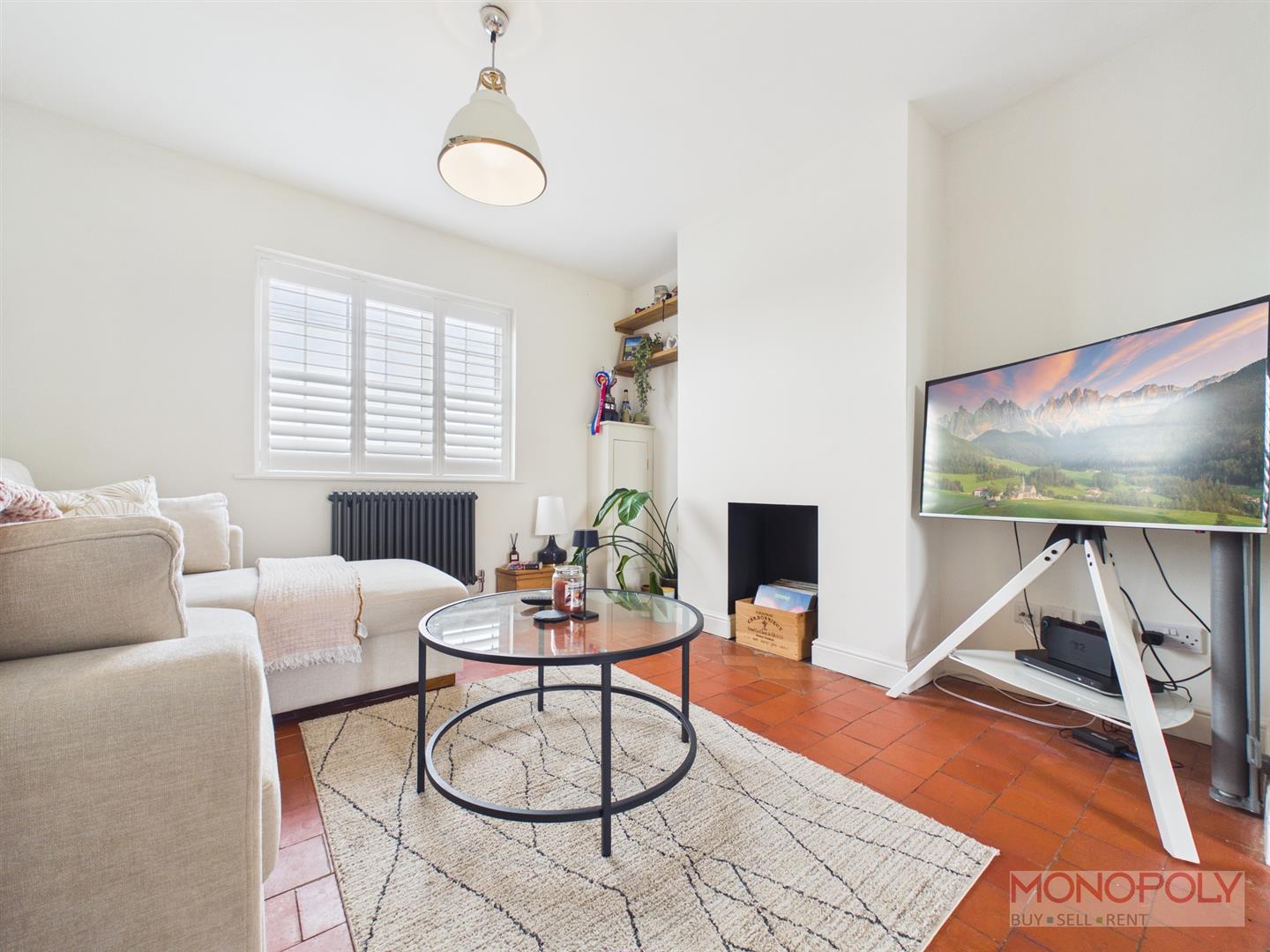 UPVC double glazed window to the front elevation with customised composite bi-fold shutters. Original tiled flooring, anthracite style radiator, ceiling light point, cupboard housing meters and electric box, fireplace alcove and archway leading into dining room.