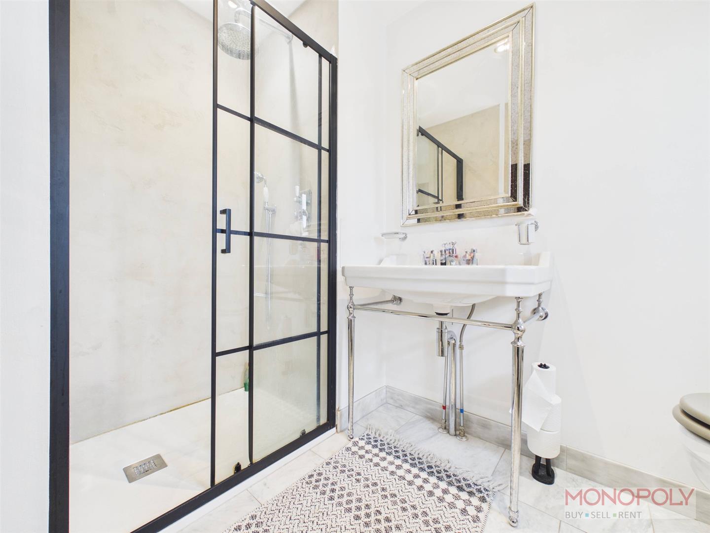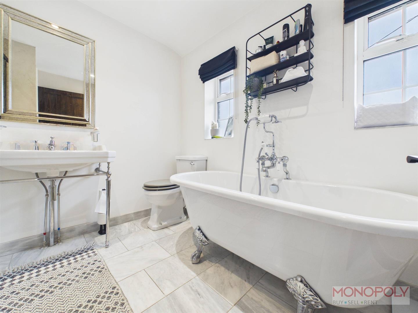 A beautifully presented four-piece Burlington bathroom suite featuring a freestanding roll-top bath with traditional fittings, low level WC, elegant pedestal wash hand basin and a separate walk-in shower with contemporary black framed screen. Finished with tiled flooring, sleek microcement shower splashback, extractor and recessed LED lighting, Two uPVC double glazed frosted windows to the front elevation fitted with Roman blinds.