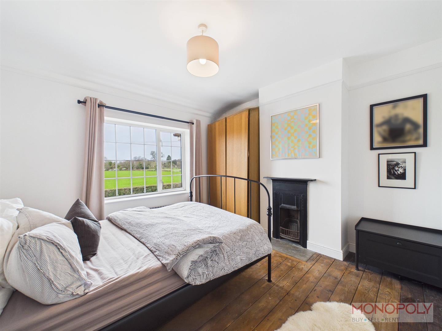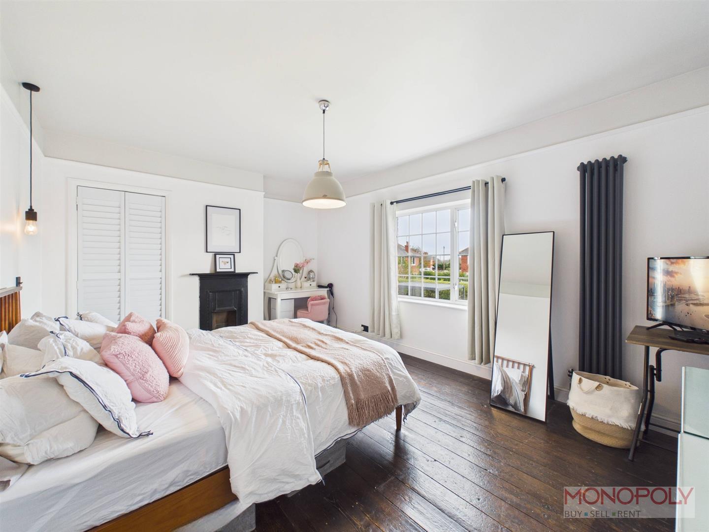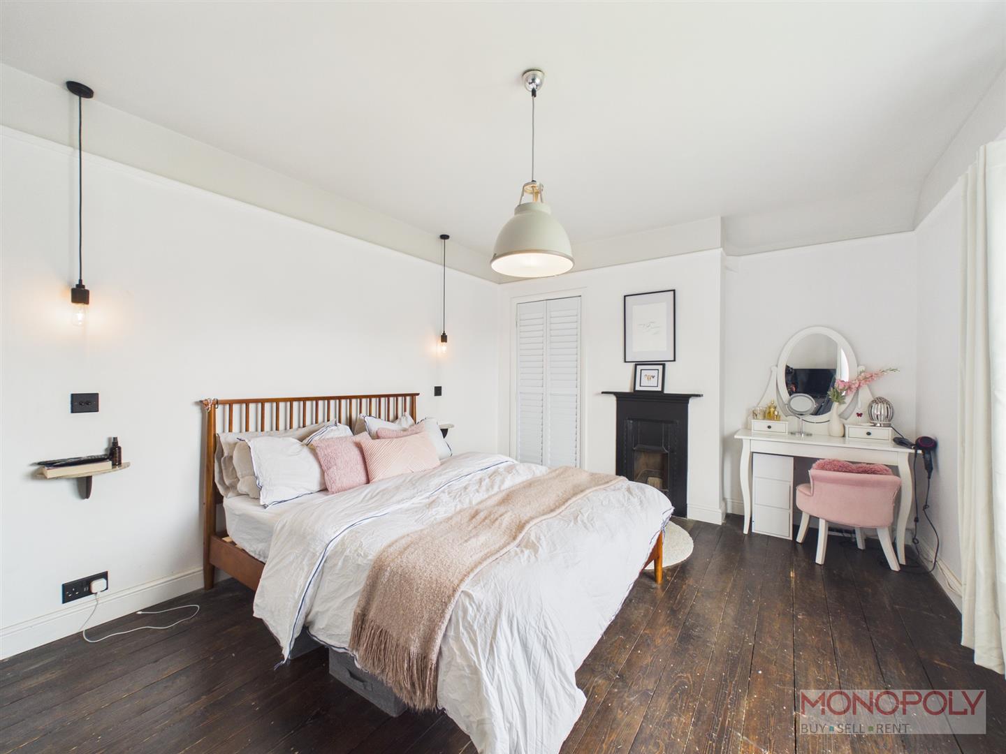 Spacious bedroom with uPVC double glazed window to the rear elevation overlooking the garden. Feature fireplace with decorative surround, built in storage, exposed original wooden flooring, anthracite vertical radiator, a mix of contemporary pendant lighting and minimalist wall-mounted bedside lights.