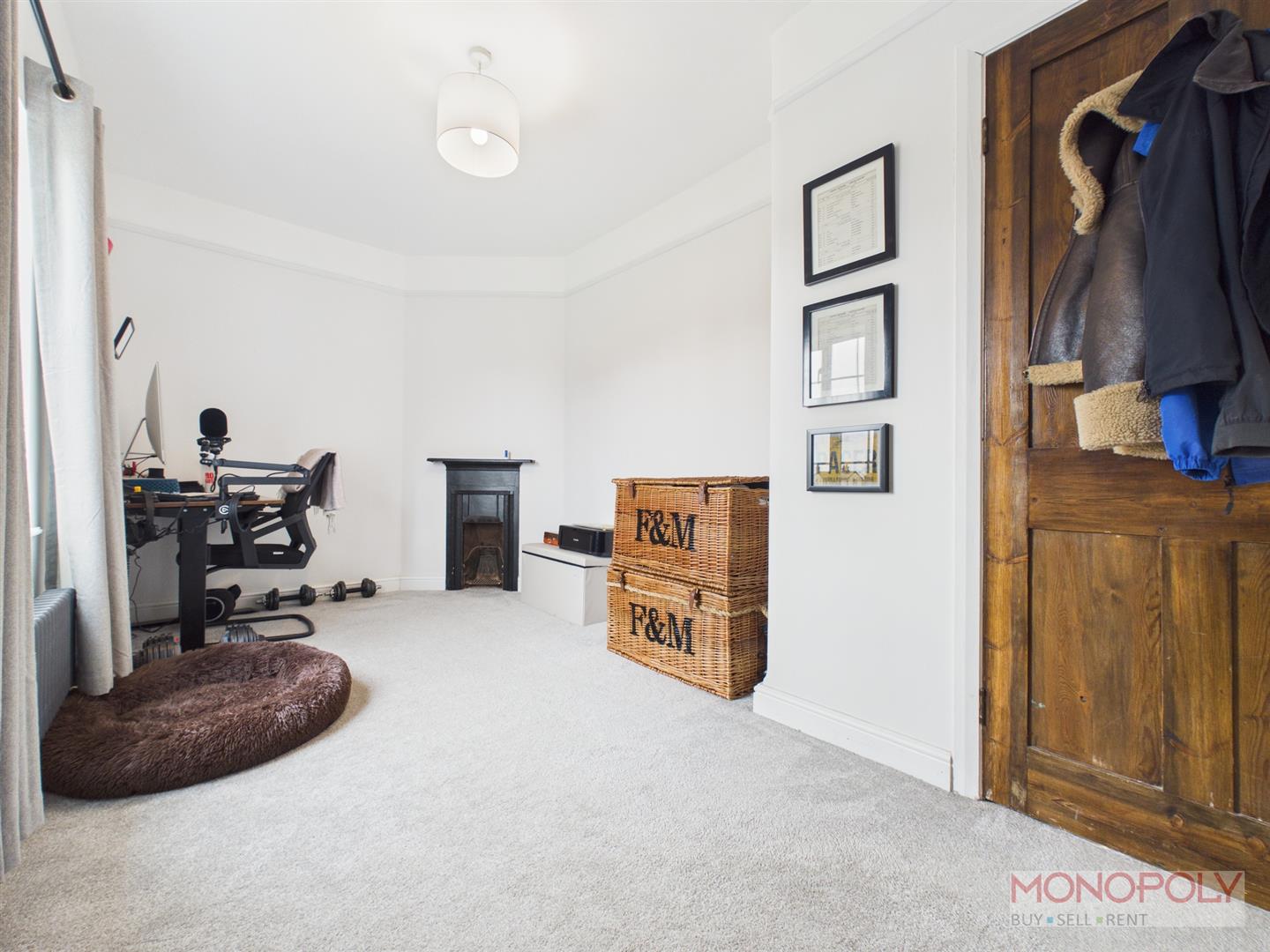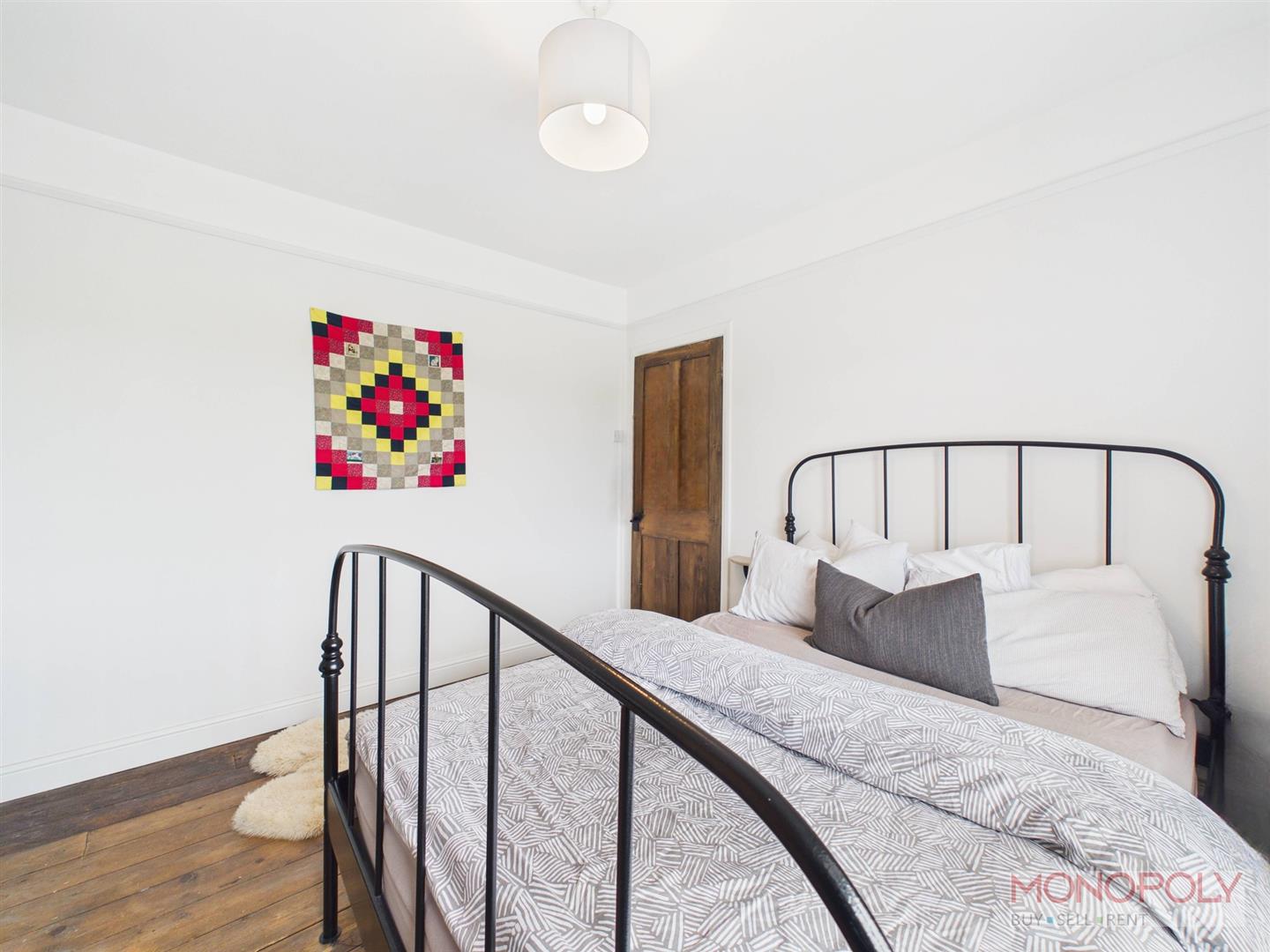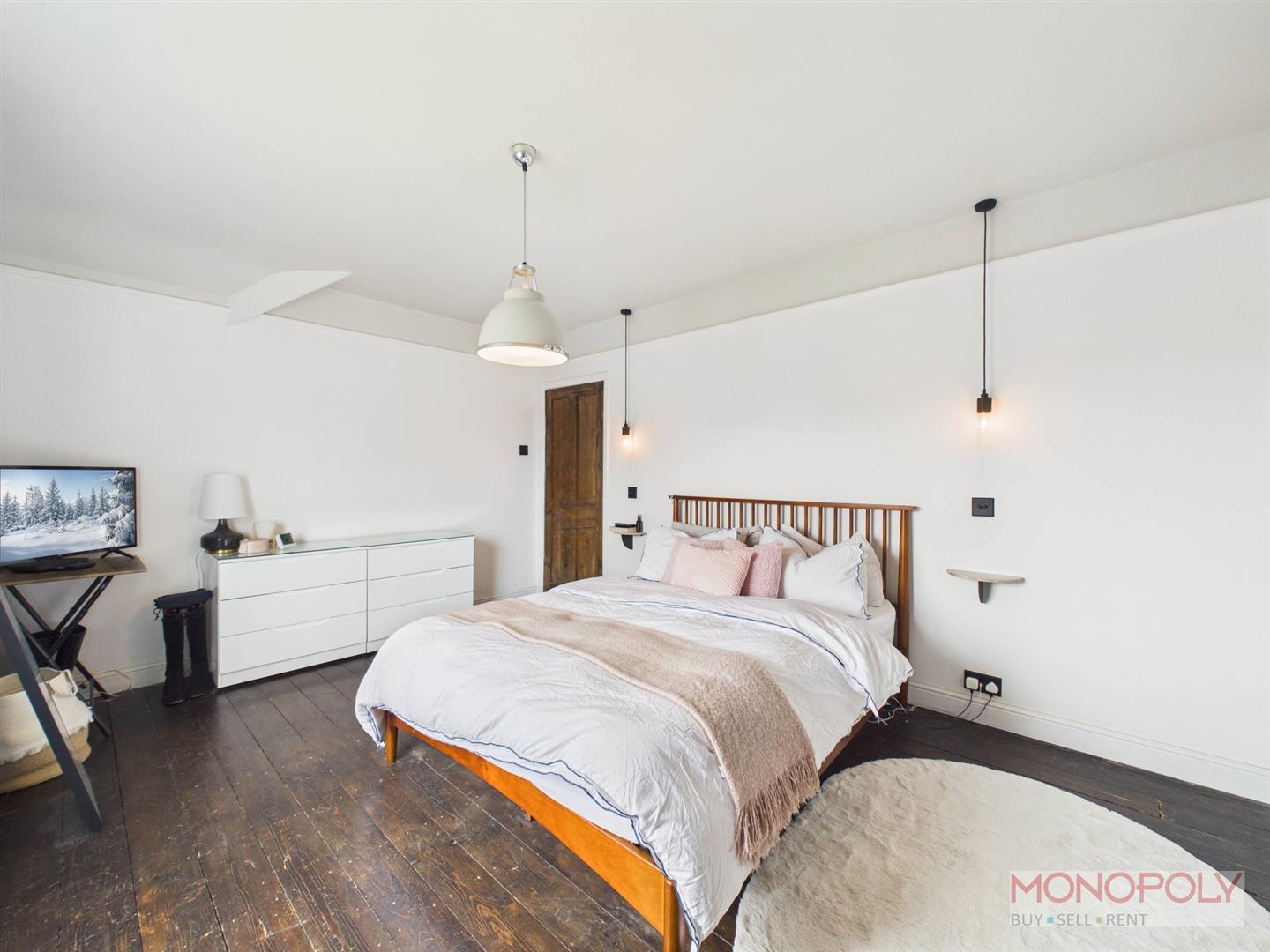 Spacious bedroom with uPVC double glazed window to the rear elevation overlooking the garden. Feature fireplace with decorative surround, built in storage, exposed original wooden flooring, anthracite vertical radiator, a mix of contemporary pendant lighting and minimalist wall-mounted bedside lights.