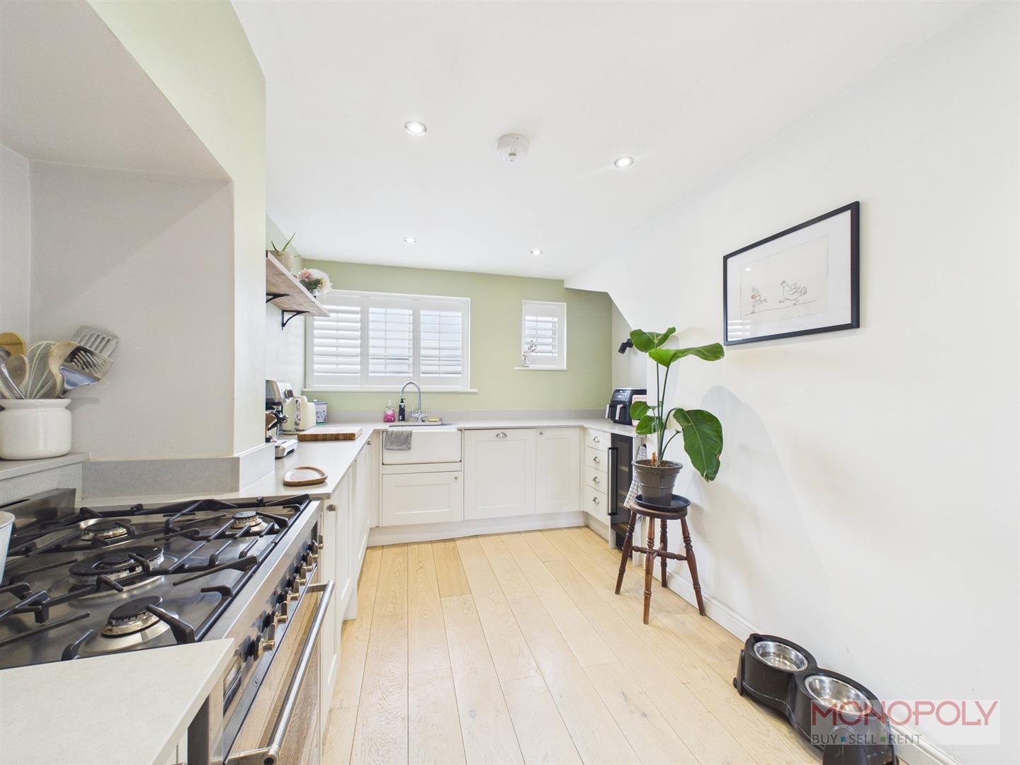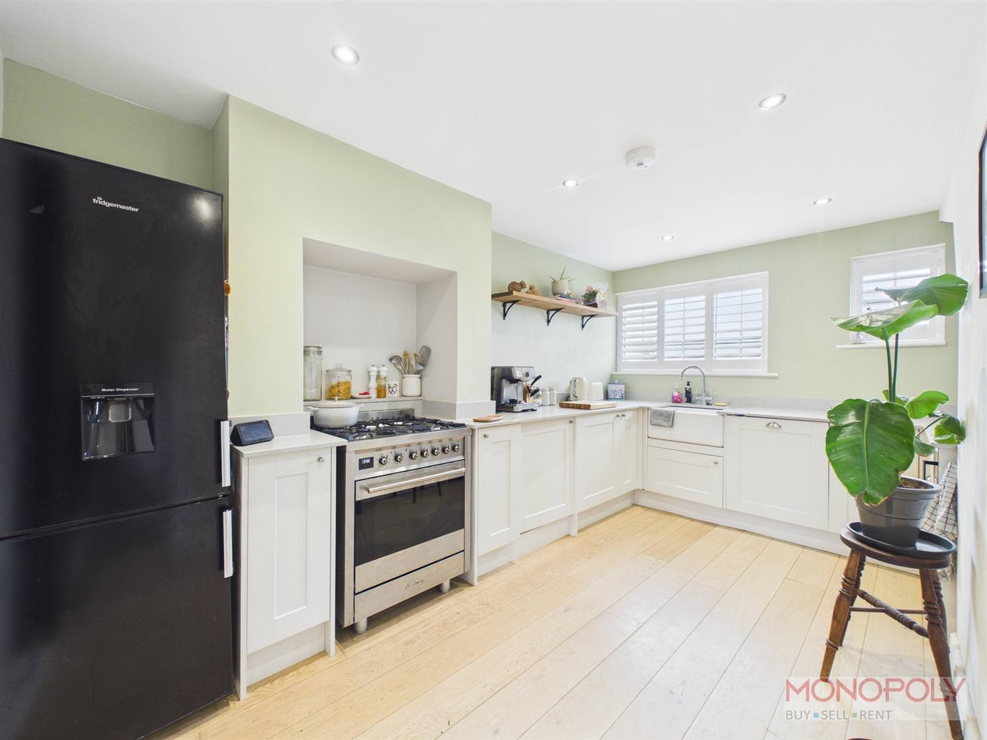Newly fitted Howdens kitchen housing a range of wall, drawer and base units with granite work surfaces over, incorporating a 'Belfast' sink unit with mixer tap over. Integrated appliances to include washing machine, tumble dryer, wine fridge and 'Smeg' 900mm range-style cooker with multiple gas burners and double oven, set within a recessed alcove. Additional space for fridge-freezer. The space is completed by engineered oak flooring, anthracite vertical radiator, recessed LED lighting, two wall lights and two uPVC double glazed windows to the front elevation with composite bi-fold shutters. Opening into rear porch.