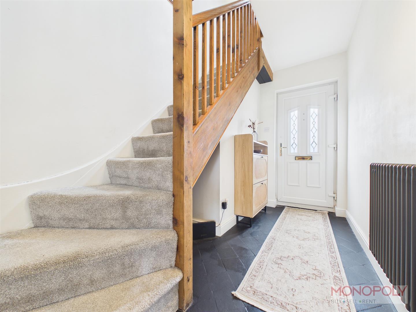 UPVC double glazed door leads into entrance hall with tiled flooring, ceiling light point, anthracite style radiator and exposed wooden turn staircase. Door leading into dining room.