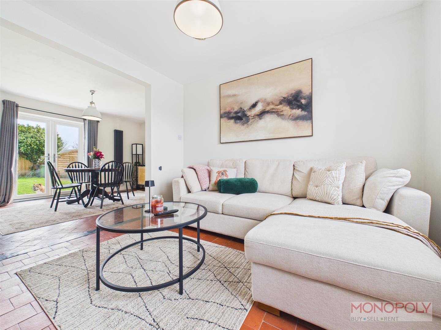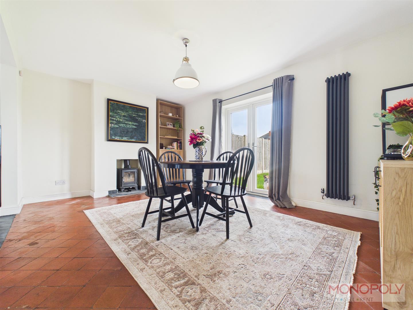 Central dining space with uPVC double glazed French doors to the rear garden area. Log burner set on a slate hearth, original tiled flooring, vertical anthracite style radiator, ceiling light point, doors into kitchen and hallway.