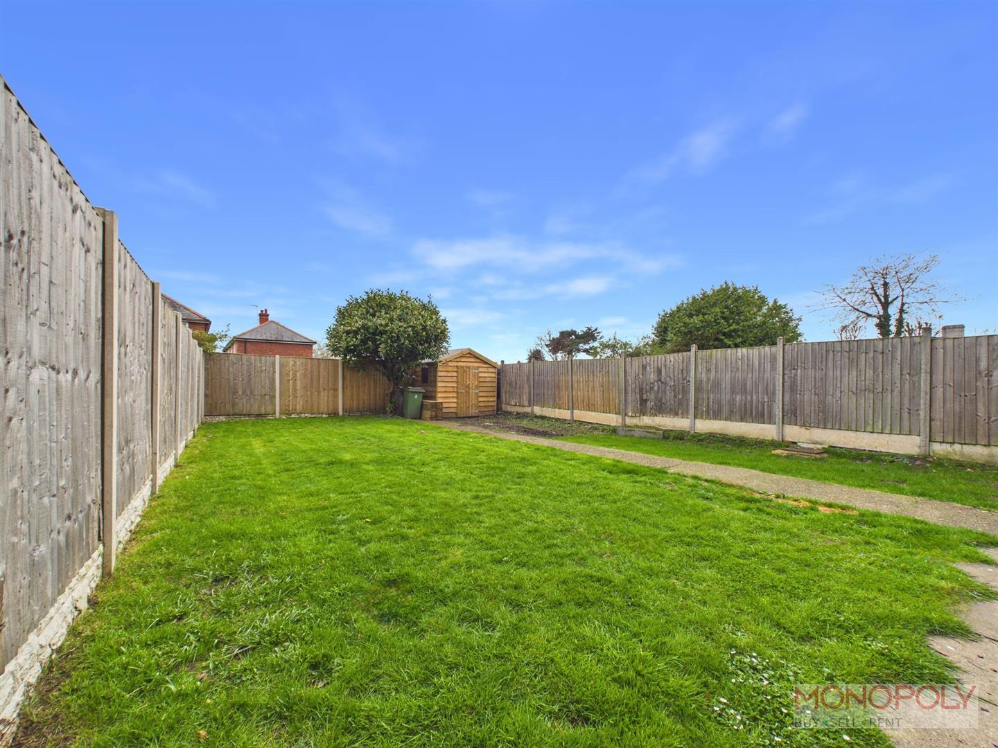 The rear garden is predominantly laid to lawn with a concrete pathway running through, complemented by a mature tree adding character and greenery. Further features include a newly installed timber storage shed, external lighting, outside tap and enclosed fencing to the boundaries, offering a good degree of privacy and security.