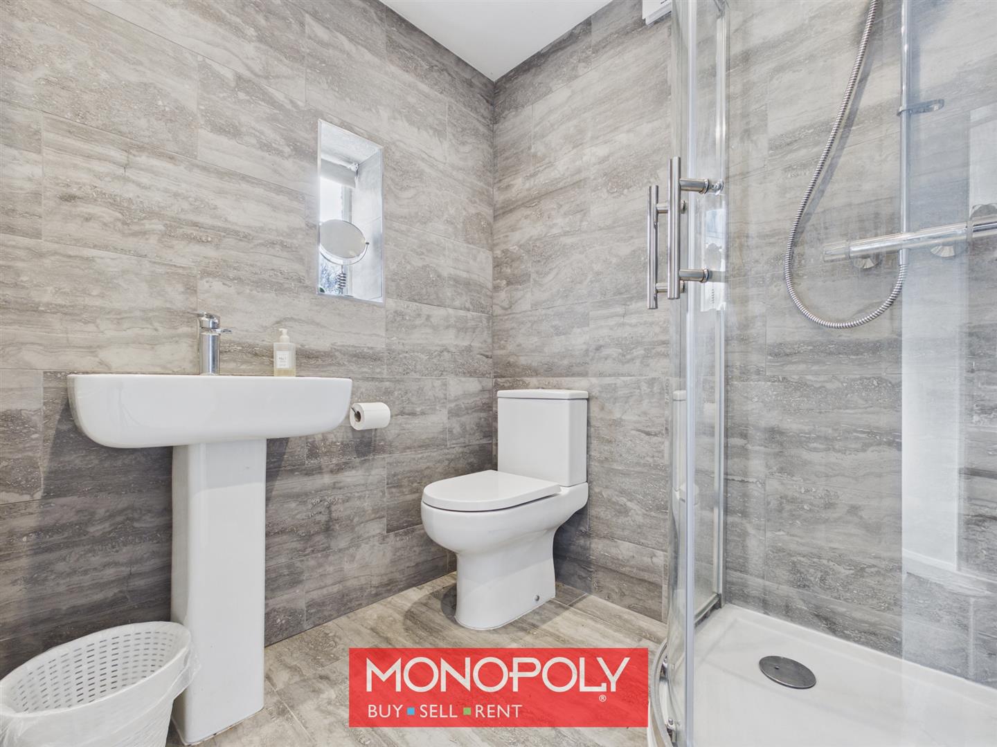 The shower room is appointed with tiled flooring, partially tiled walls, a shower with curved enclosure, toilet, and a large wash basin with stainless steel tap. Further features include a radiator, a small window to the front, downlights, and a mirror with built-in cabinet.