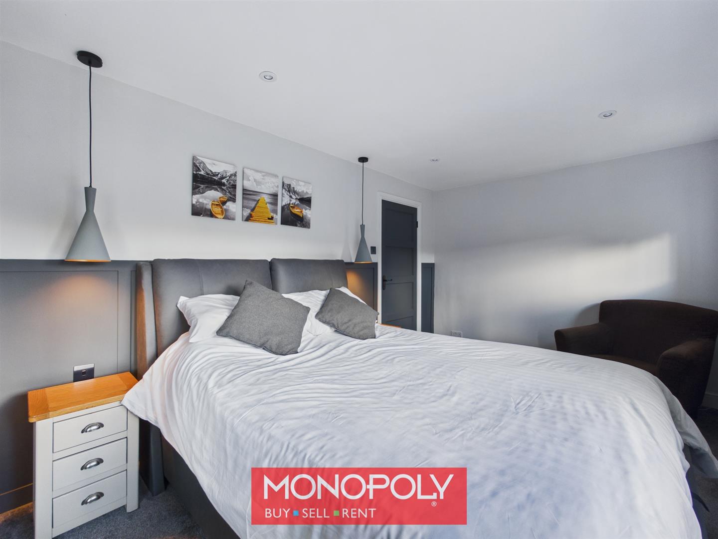 The front garden has been designed for ease of maintenance and is laid with block paving, with a short concrete wall forming a neat boundary from the road. To the left-hand side, a wooden gate provides access to the rear garden and offers a convenient and discreet area for bin storage.