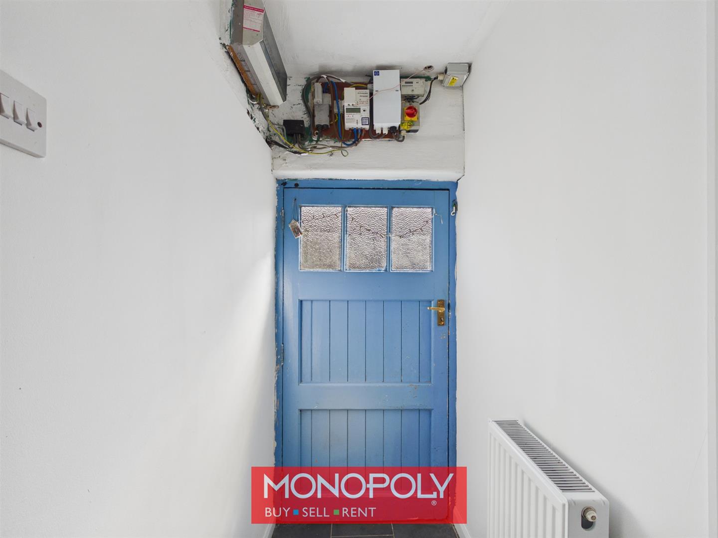 The entry hallway features tiled flooring, a wooden front door with obscure glazed panels, a radiator, and houses the panel box and meter. Doors lead through to the kitchen, shower room and utility.