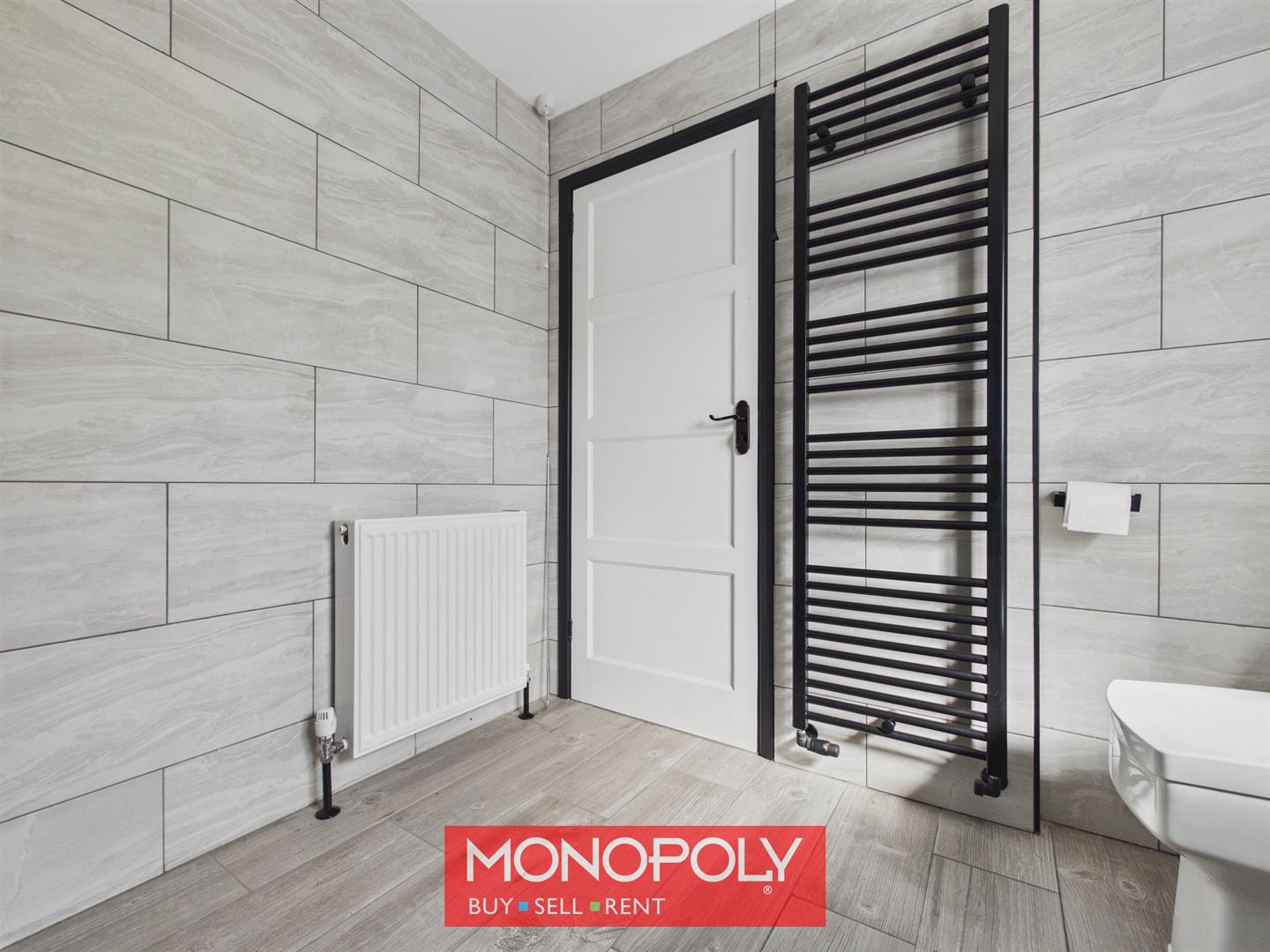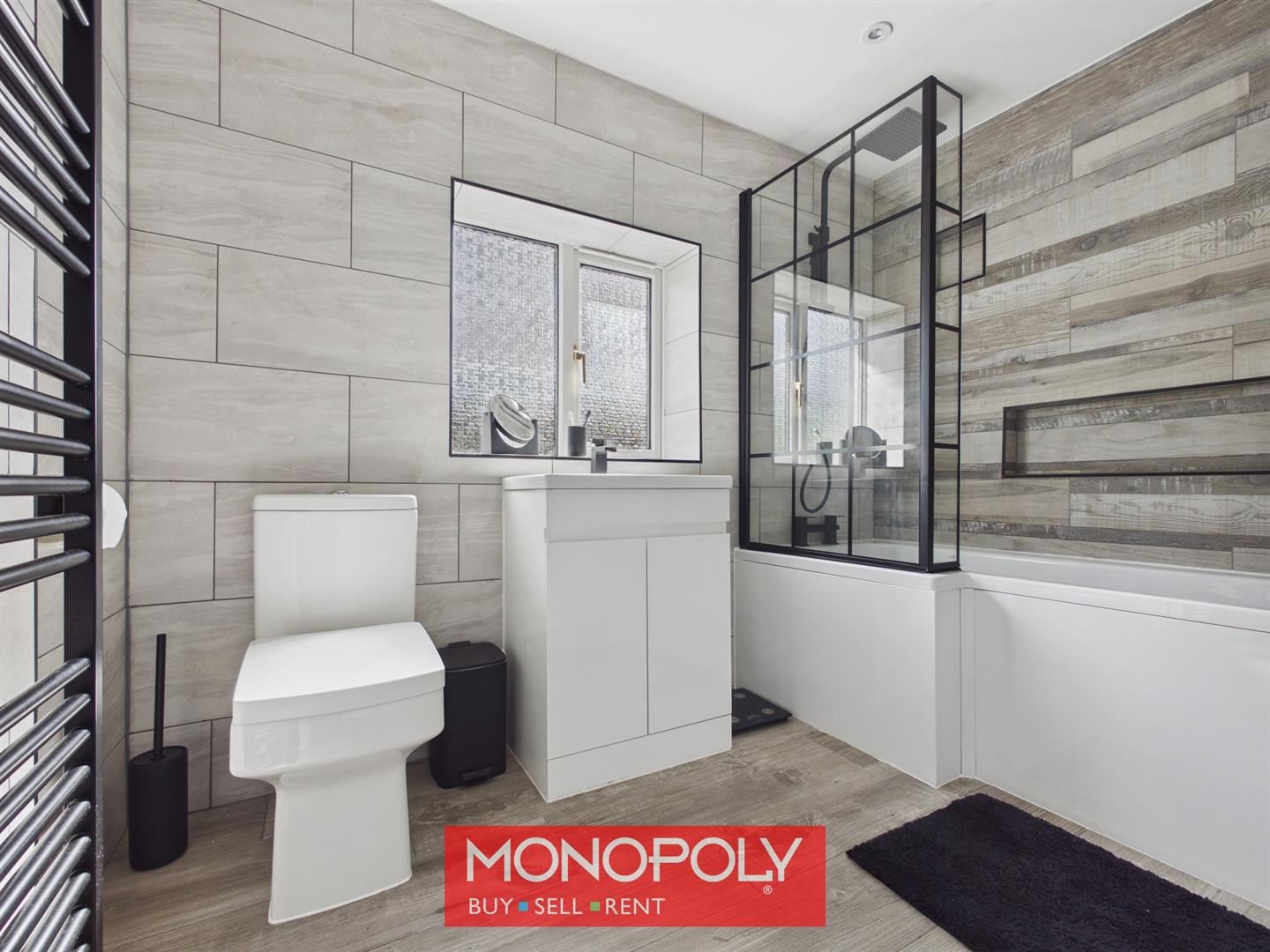 The bathroom is fitted with tiled flooring and walls and comprises a bath with screen, toilet, wash hand basin with cupboard beneath, and a towel radiator. There is also an obscure double glazed window to the front and downlights.