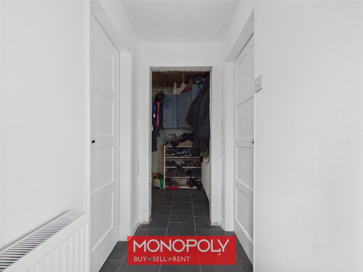 The hallway is finished with LVT flooring and includes a storage cupboard, radiator, under-stairs storage, and carpeted stairs rising to the first floor. Doors lead through to the lounge and kitchen.