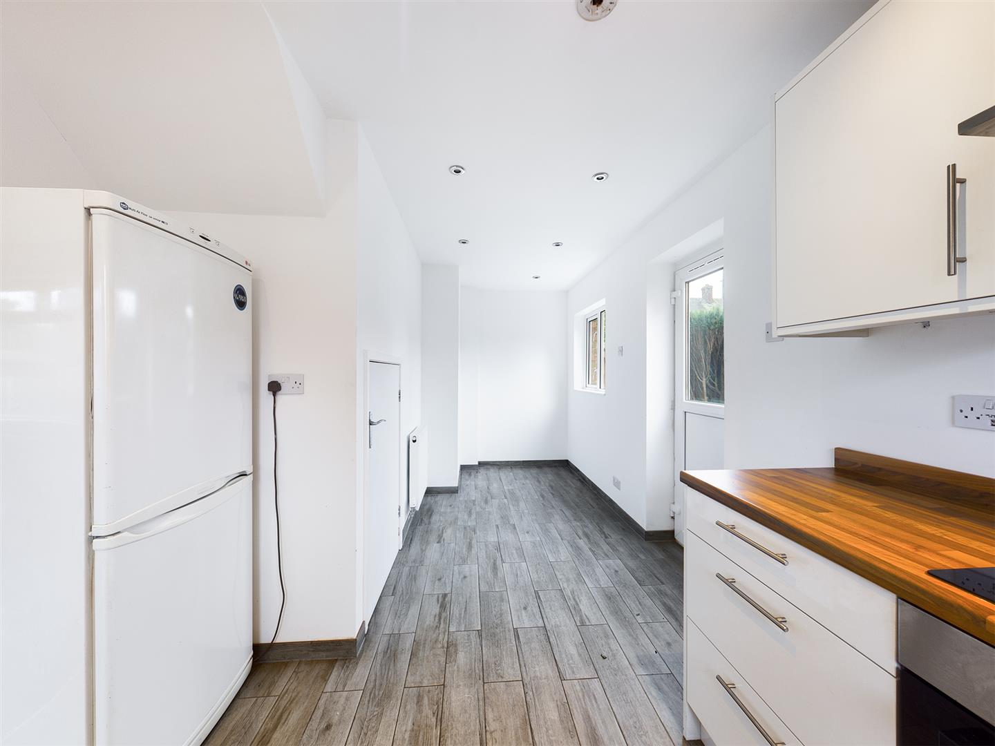 Well appointed with a modern fitted kitchen offering a range of white gloss wall, drawer and base units, wood effect work surfaces with inset 1 1/4 sink and drainer, built in electric oven, 4 ring electric hob, tiled splash back, stainless steel extractor fan, plumbing for a washing machine, space for a fridge/freezer, 2 double glazed windows, storage recess, wood effect tiled flooring, door off to the side.